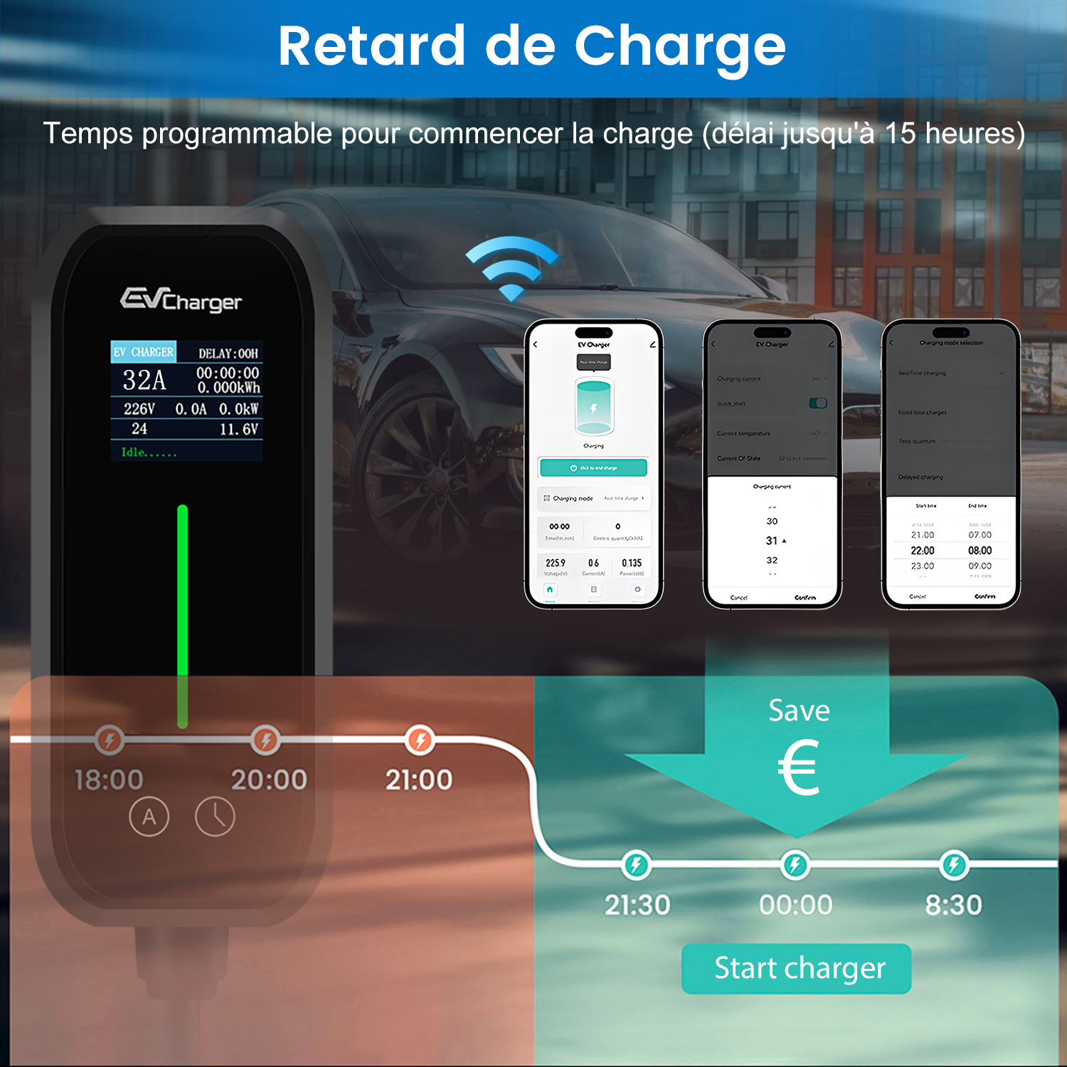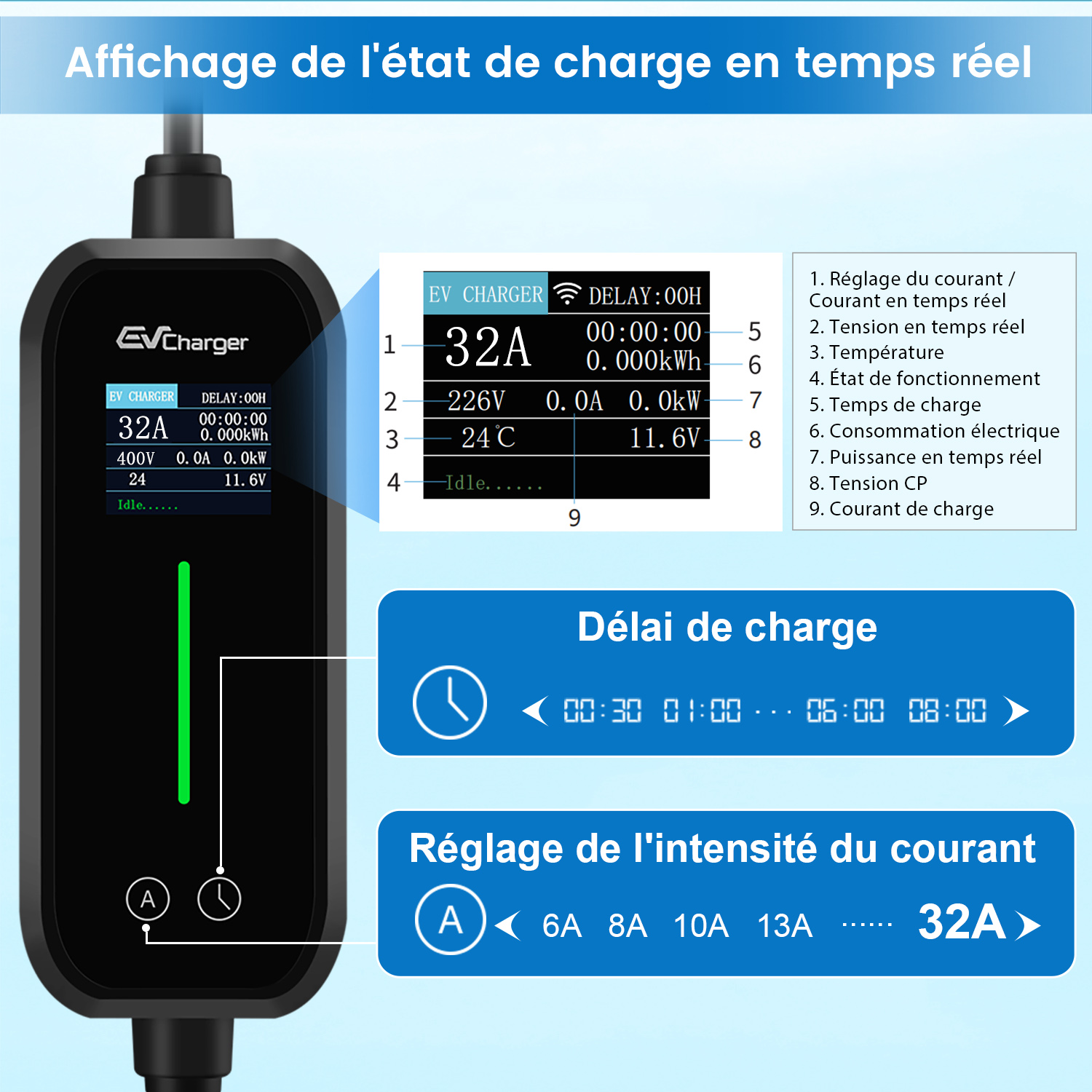 Réglage intelligent du courant : 8 paliers (6A, 8A, 10A, 13A, 16A, 20A, 24A, 32A)