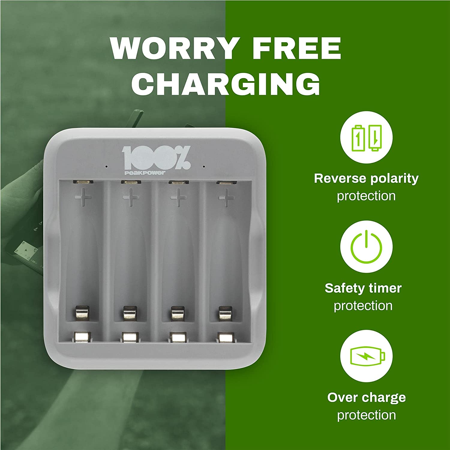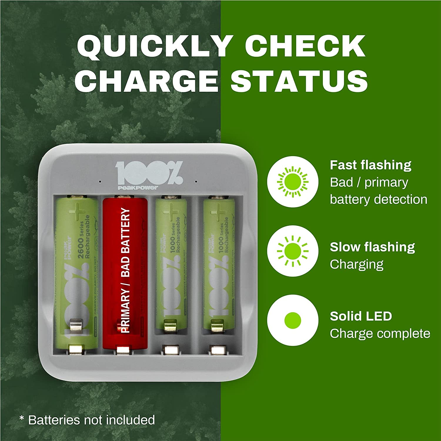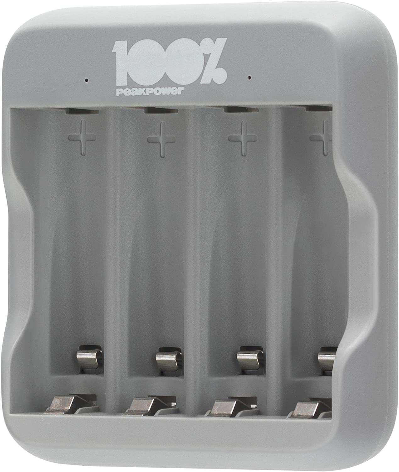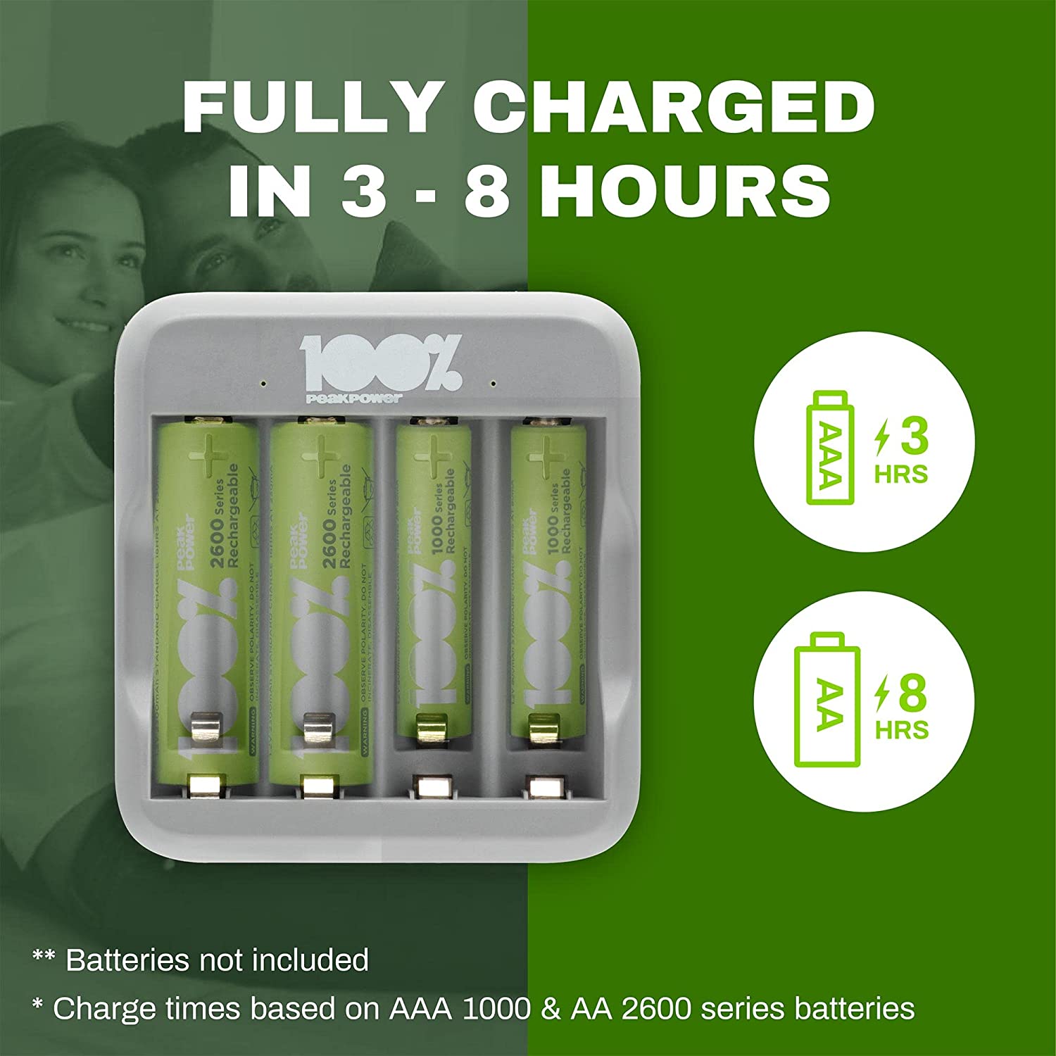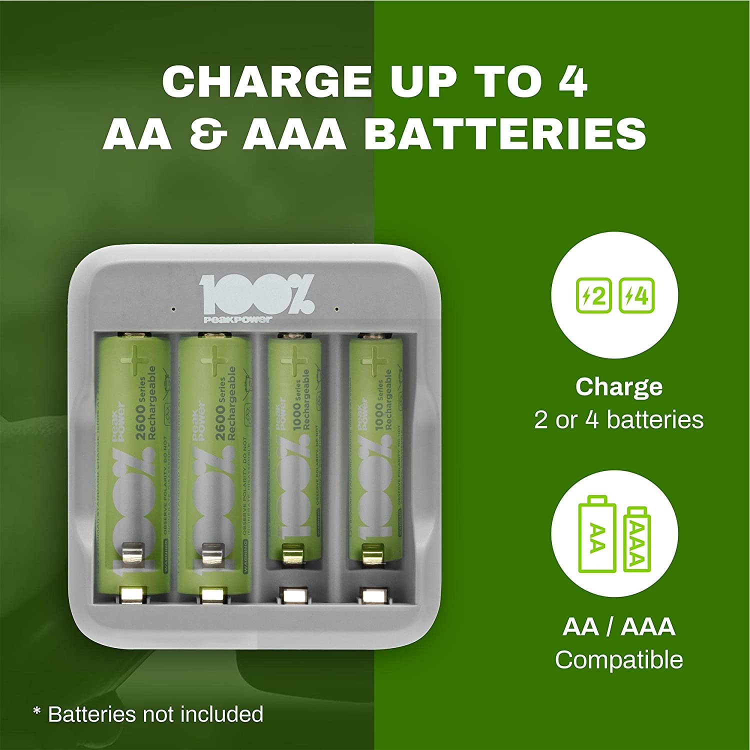 Chargeur rapide de batterie AA et AAA avec 4 emplacements | 100% PEAKPOWER | Piles non incluses | Chargeu
