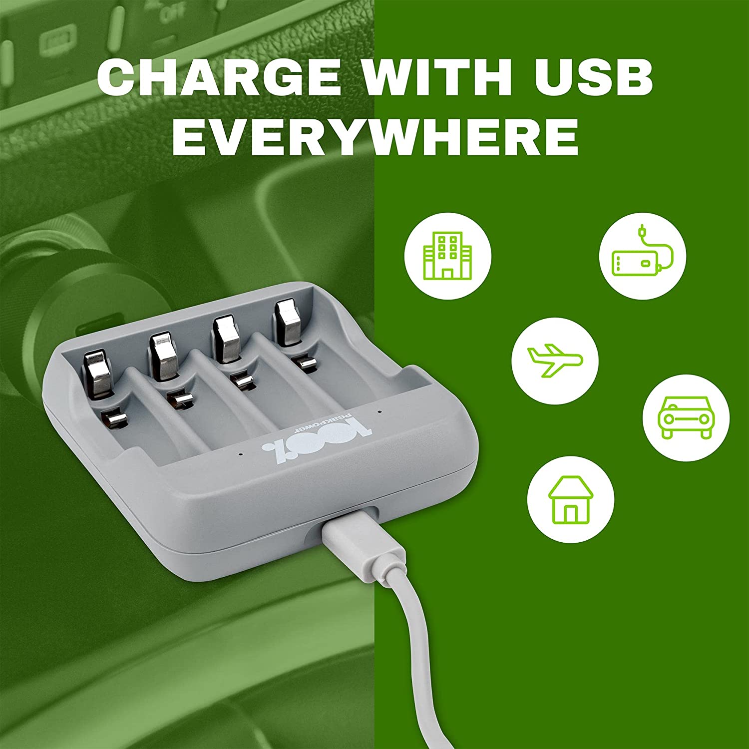 | Libellé | Chargeur rapide de batterie AA et AAA avec 4 emplacements | 100% PEAKPOWER | Piles non incluses | Chargeur USB NiMH haute protection |