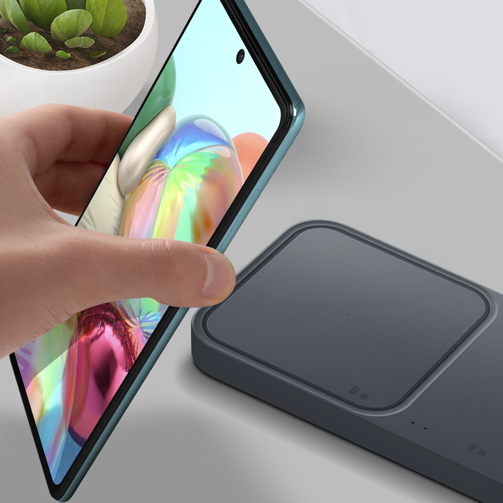 Chargeur sans fil QI d'Origine Samsung EP-P5400. Double socle pour charger 2 appareils en même temps. Puissance maximale de 15W pour une charge rapide. Conforme aux normes CE et RoHS. Indicateur LED. Surface antidérapante. Dimensions : 9 x 9 x 1.8 cm.