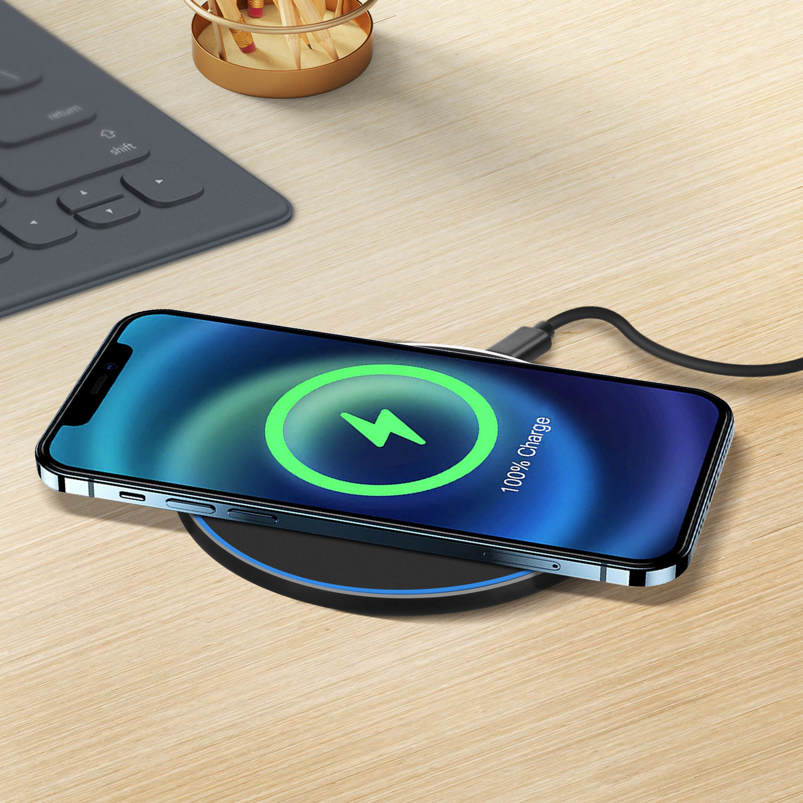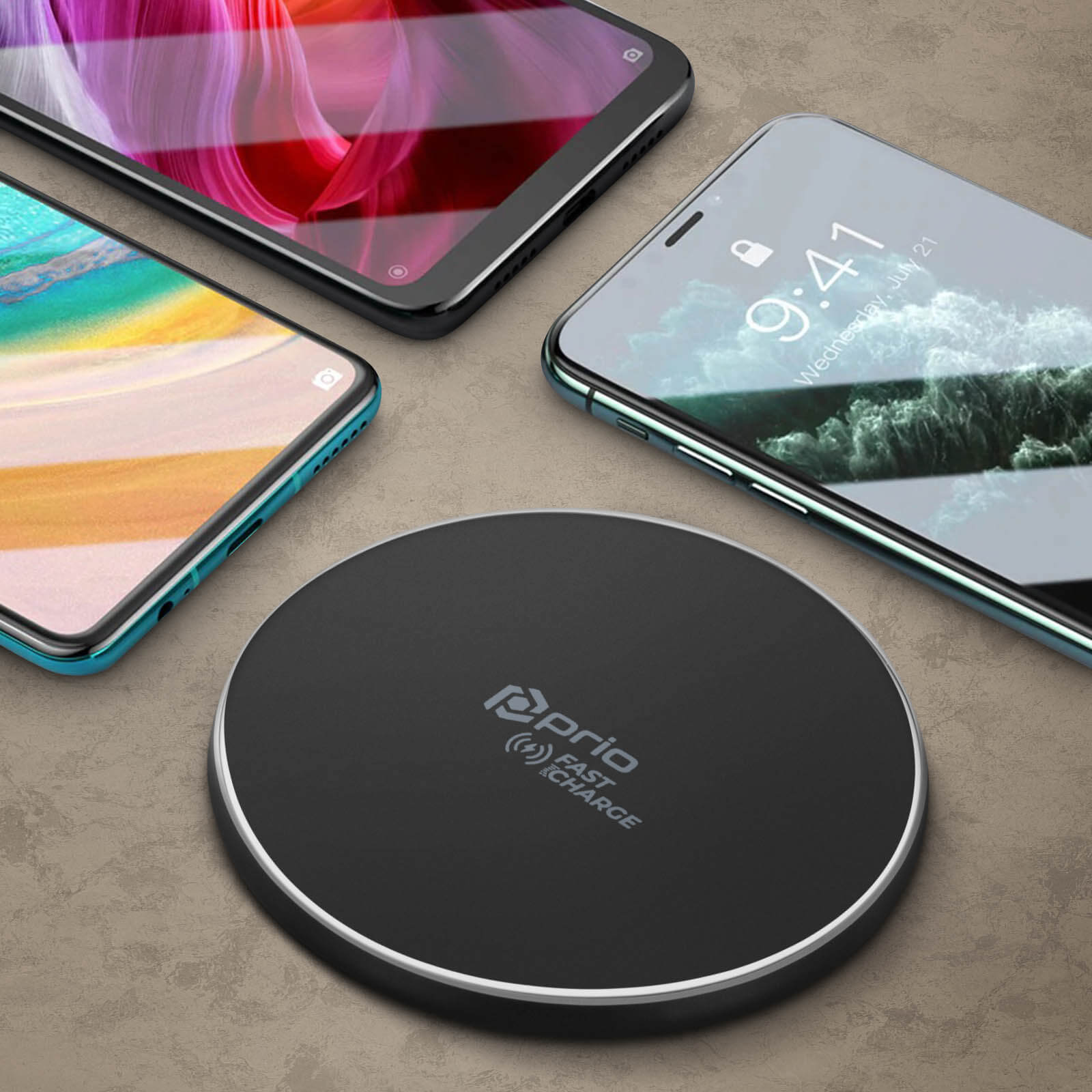 Chargeur à induction QI 15W signé Prio. Compatible avec charge sans fil rapide Apple (15W / 7.5W) et Samsung (10W). Recharge sûre et adaptative. Base antidérapante + patins en caoutchouc. Conception minimaliste. LED indicateur. Livré avec un câble USB-C.