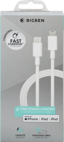 | Accessoires inclus | Câble USB C / Lightning 3A 2m PD 60W + Guide d'utilisation/Sécurité/Garantie |