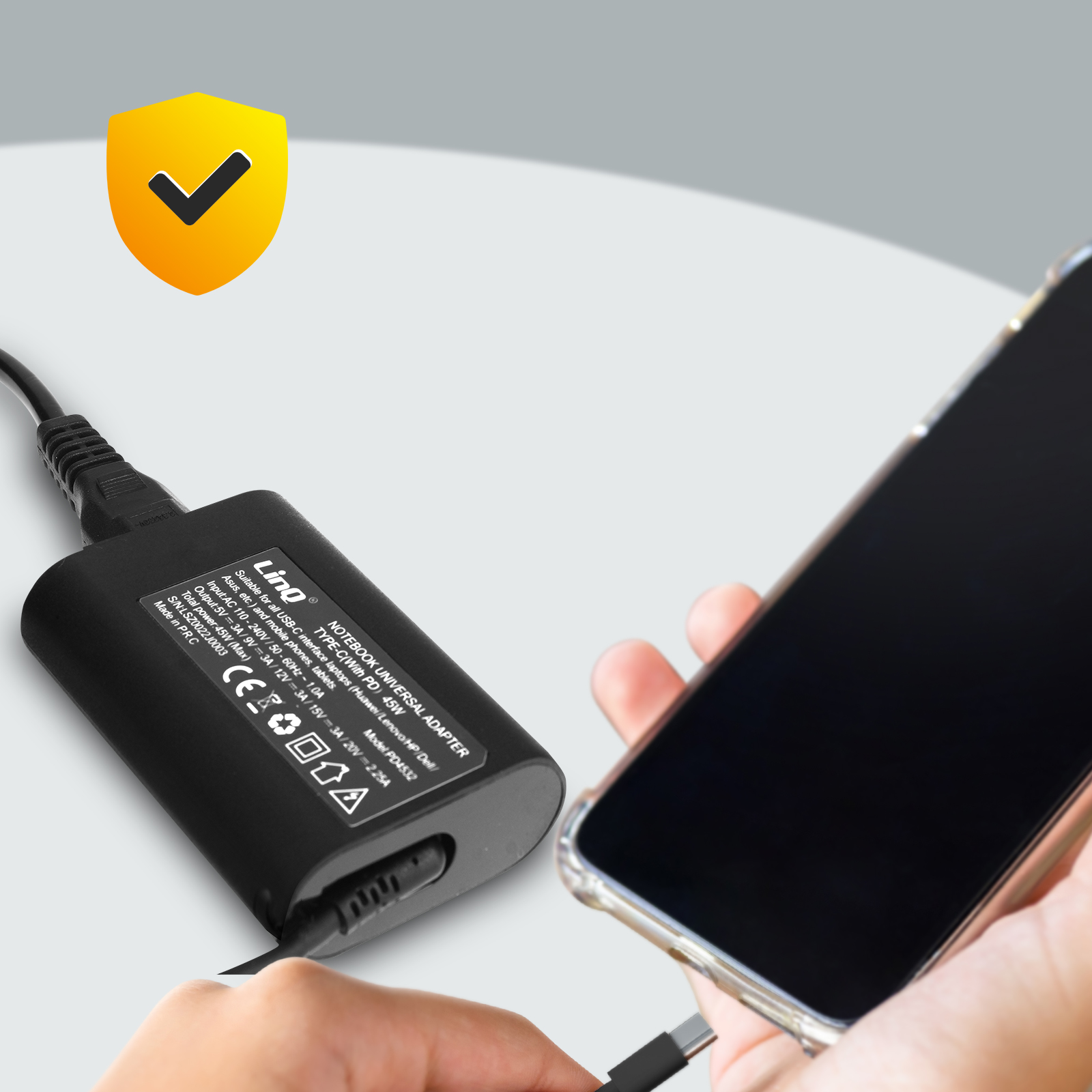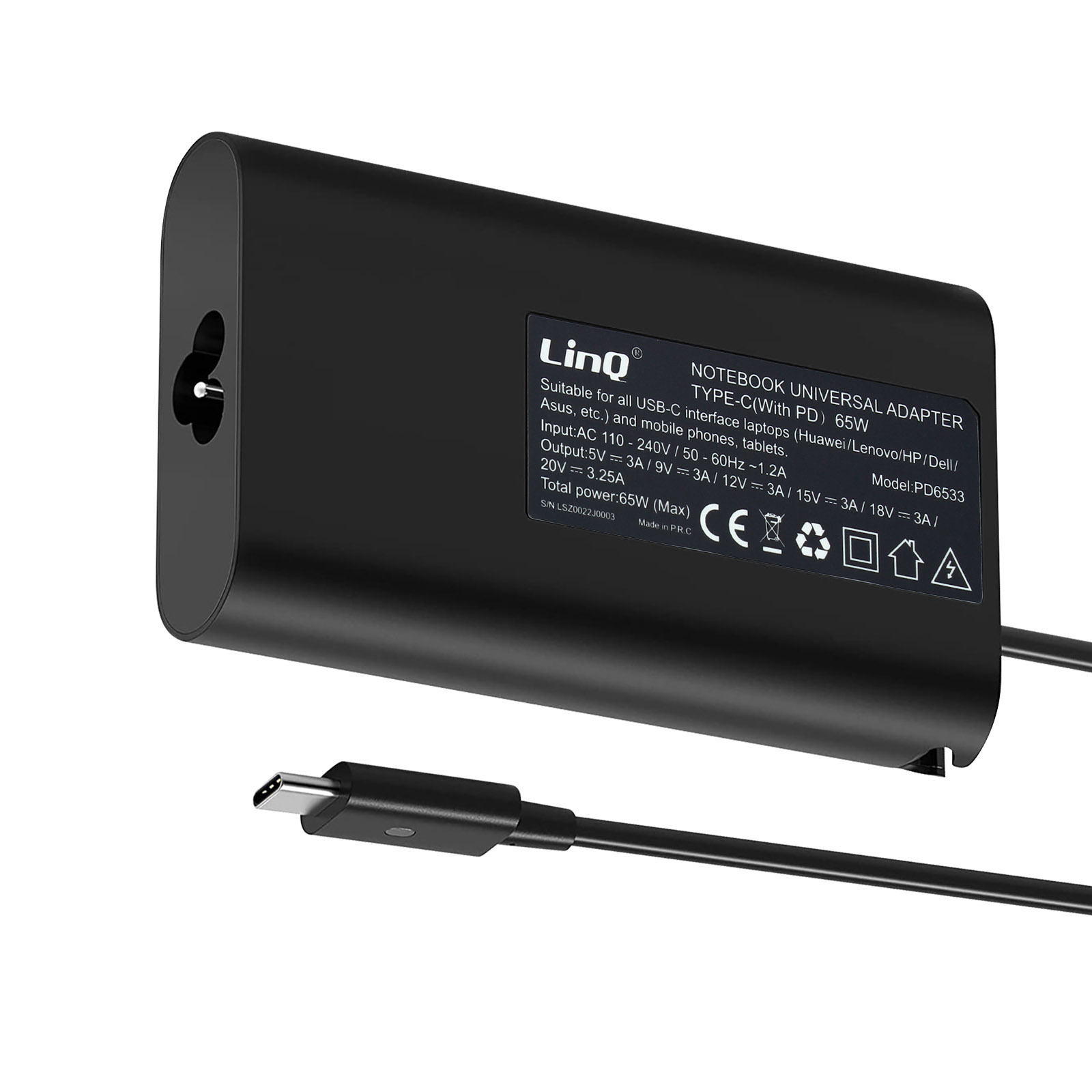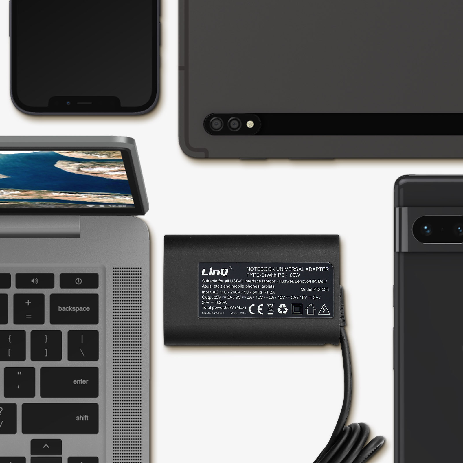 Chargeur secteur de LinQ. Puissance 65W pour une charge rapide. Câble USB-C d'une longueur de 1.8m intégré. Recharge sécurisée. Format compact. Compatible avec PC portable, smartphone, tablette.