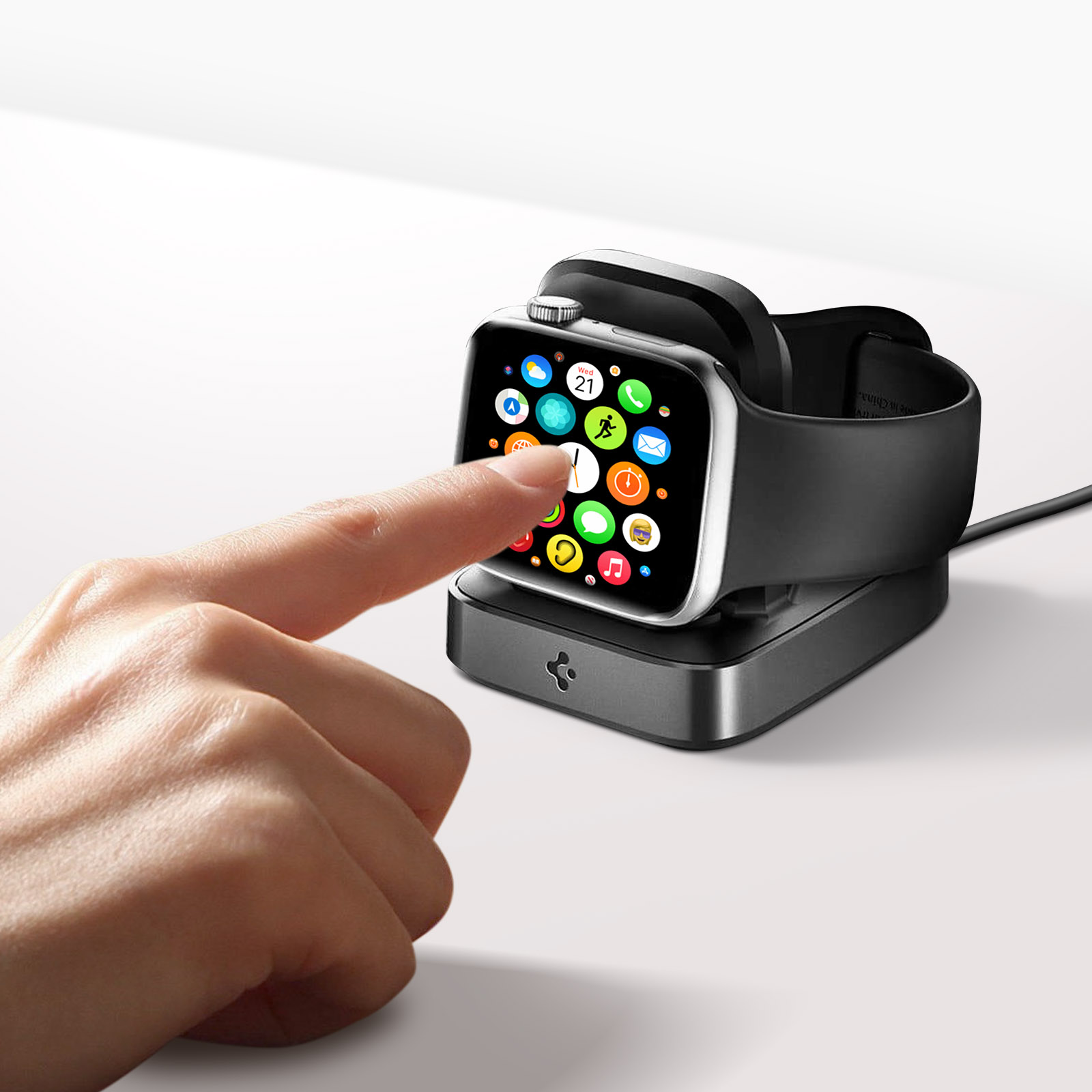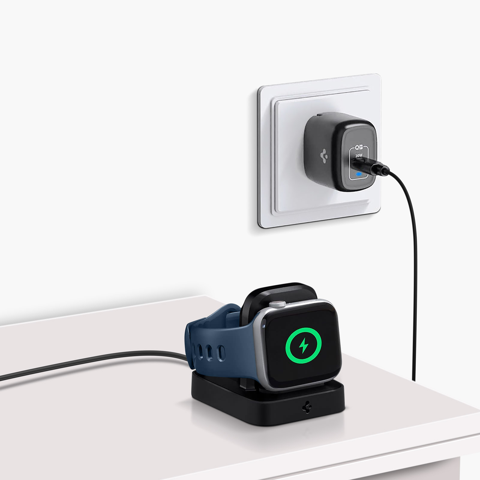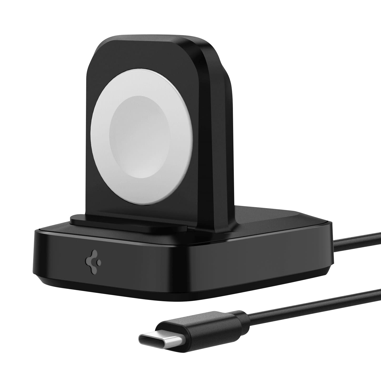 Chargeur support magnétique pour Apple Watch, Spigen. Recharge rapide et sécurisée. Doté de 5 patins antidérapants. Écran à portée de vue. Mise en place facile grâce au système aimanté. Format compact. Câble USB-C de 2m intégré pour une utilisation facile
