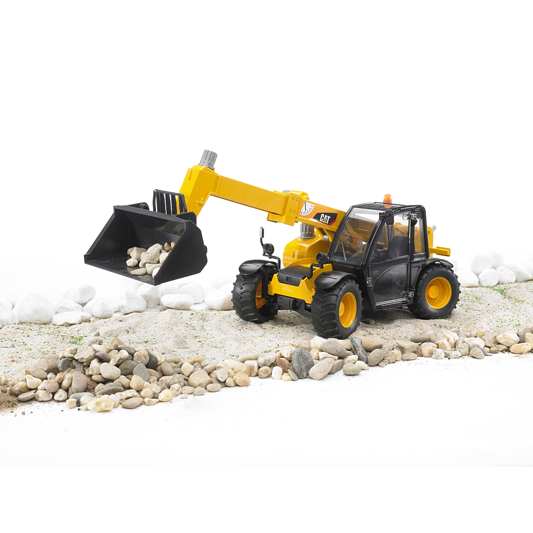CHARGEUR TELESCOPIQUE CATERPILLAR, porte ouvrante avec bras de télescopique fonctionnel grâce à différentes manivelles, direction à 4 roues motrices Ce télescopique Bruder peut être complété par les accessoires pour télescopique Bruder (non inclus). Dimensions : 33,5 x 14,2 x 14 cm, A partir de 3 ans.