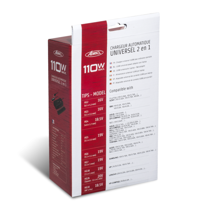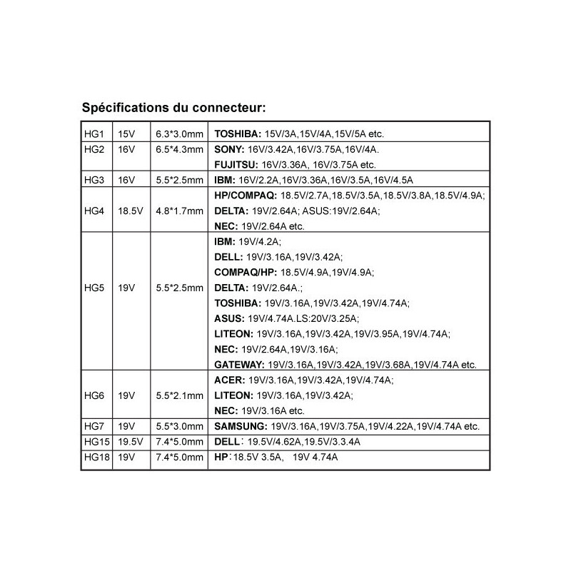 - 9 embouts compatible avec différentes marques : Fujitsu, Sony, IBM, Asus, HP-Compaq, DELL, Toshiba, Acer, Samsung, Lenovo