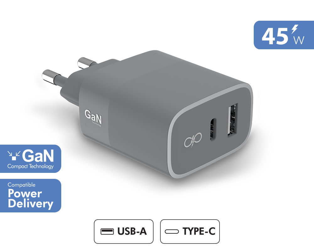Chargeur USB A + USB C 45W (30+12W) Power Delivery GaN Gris + Garantie à vie Force Power