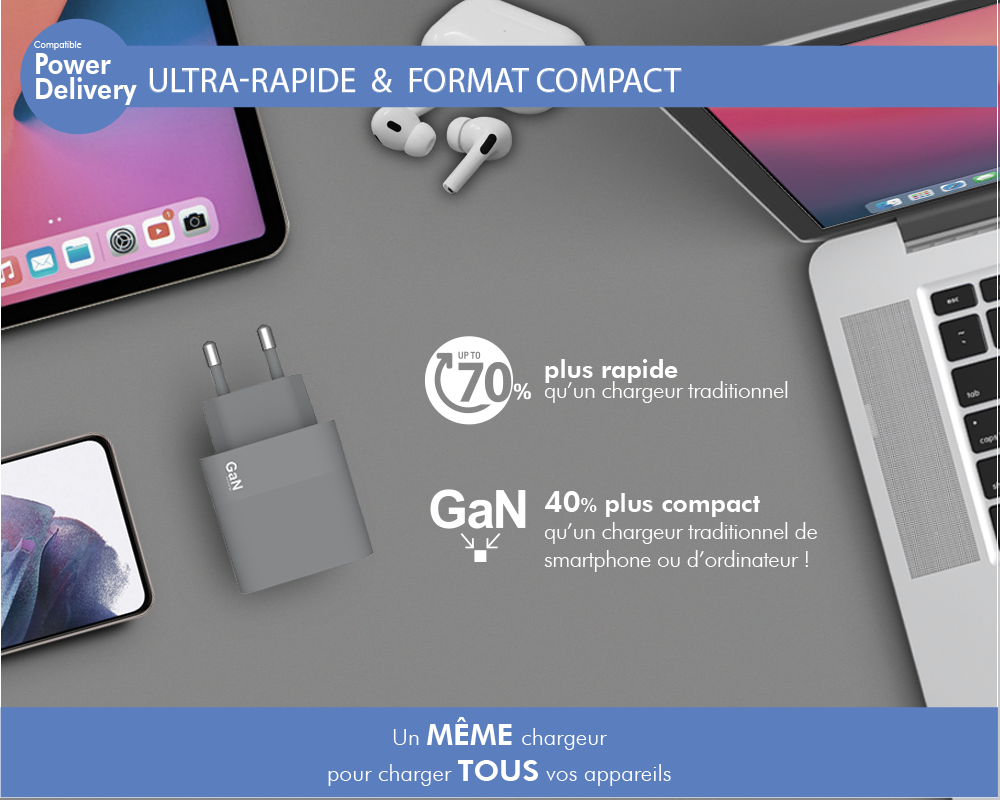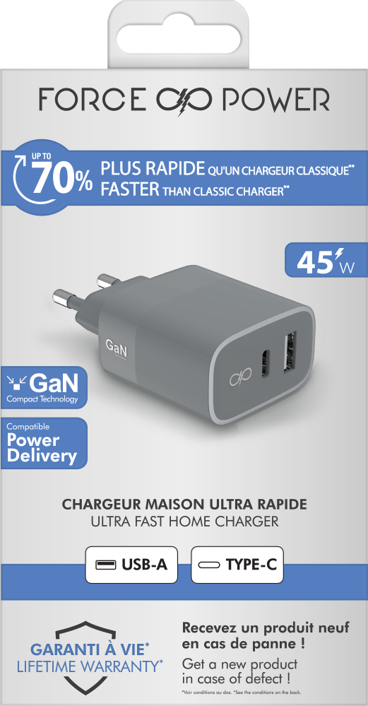 Le double chargeur maison Force Power compatible Power Delivery garantit une charge ultra rapide pour vous accompagner efficacement au quotidien. Power Delivery : une vitesse de charge inégalée Son protocole de rechargement compatible Power Delivery est bien plus efficace que les technologies de recharge conventionnelles. Compatible avec les appareils iOS (Apple) et Android (Google, Samsung, Xiaomi, Oppo...), il offre une alternative ultra rapide, sûre et pratique pour charger tous vos appareils. Rechargez 2 ports simultanément Les deux entrées USB-A et USB-C de votre chargeur offre une vitesse de charge maximale de 45W (12W en USB A et 30W en USB C PD) afin de recharger votre appareil jusqu'à 70 % plus rapidement qu'une technologie standard de 5 W*. Cette technologie vous permettra notamment de charger jusqu'à 50 % de la batterie de votre iPhone 8 ou modèle ultérieur ou de votre Samsung S20 ou modèle supérieur en 30 minutes environ ! Compatibilité Power Delivery Pour bénéficier de la vitesse de charge optimale d'un chargeur Power Delivery, vous avez besoin d'un appareil Apple ou Android compatible avec cette technologie, un câble de charge USB type C vers USB type C ou Lightning vers USB type C et d'un chargeur compatible USB-PD. Technologie GaN ultra compacte Des composants miniaturisés pour une compacité extême. Le chargeur est beaucoup moins encombrant qu'un chargeur traditionnel ou qu'un chargeur d'ordinateur, ce qui le rend facile à transporter pour une utilisation quotidienne ou en déplacement. Charge intelligente et éco-responsable Le chargeur détecte automatiquement le courant de charge nécessaire à une charge rapide. Lorsque le niveau de charge atteint 100%, il coupe l'alimentation et évite ainsi à la batterie de fonctionner sans interruption. Cette technologie innovante évite le risque de surchauffe et donne une durée de vie plus longue à la batterie. Lorsque vous êtes pressé, nos chargeurs donnent un coup de fouet à votre batterie en un rien de temps. Solide et sécurisé Assure une résistance aux chocs, aux rayures, aux hautes températures et aux surtensions pour un usage sans risque dans le temps. Pratique et indispensable Adapté à votre utilisation quotidienne, pour la maison, le bureau ou le partage en famille ou entre amis. Smart Compagnons pensés pour faciliter l'usage Des accessoires malins offerts qui vous permettent d'améliorer l'expérience produit. Garanti à vie Force Power remplace votre accessoire de charge à neuf au cas où il s'endommagerait !* Eco-conçu avec 100% de plastique recyclé Ce produit est composé de plastique recyclé pour réduire l'utilisation de plastiques à usage unique et favoriser l'économie circulaire *Le temps de recharge dépend de la capacité de recharge des appareils mais aussi de la température, de l'usure de la batterie, de la puissance délivrée par le chargeur et du niveau de charge de l'appareil. Fonctionne avec les protocoles : AFC (Samsung), FCP (Huawei), PPS (Samsung), PD 3.0 (Apple, Samsung, Fairfone, One Plus), Apple 2.4A (Apple), QC 4.0+ (Xiaomi, Google, Samsung, Oppo, Vivo)