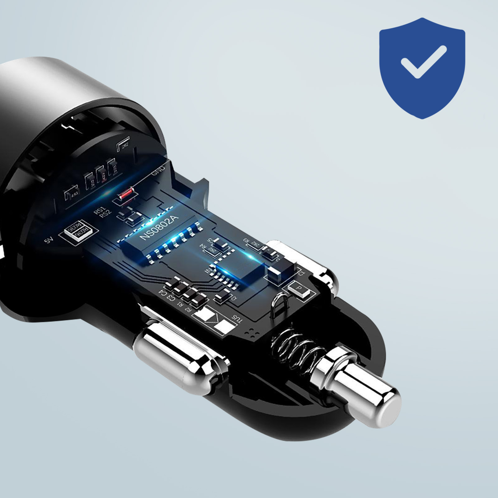 Chargeur Allume-cigare d'origine Samsung. Permettant de recharger vos appareils pendant vos déplacements. Double sortie : USB-C Super Fast Charging 2.0 de 45W et USB 15W Quick Charge Adaptive, Fast Charging. Charge rapide et sécurisée. Câble USB-C 5A.