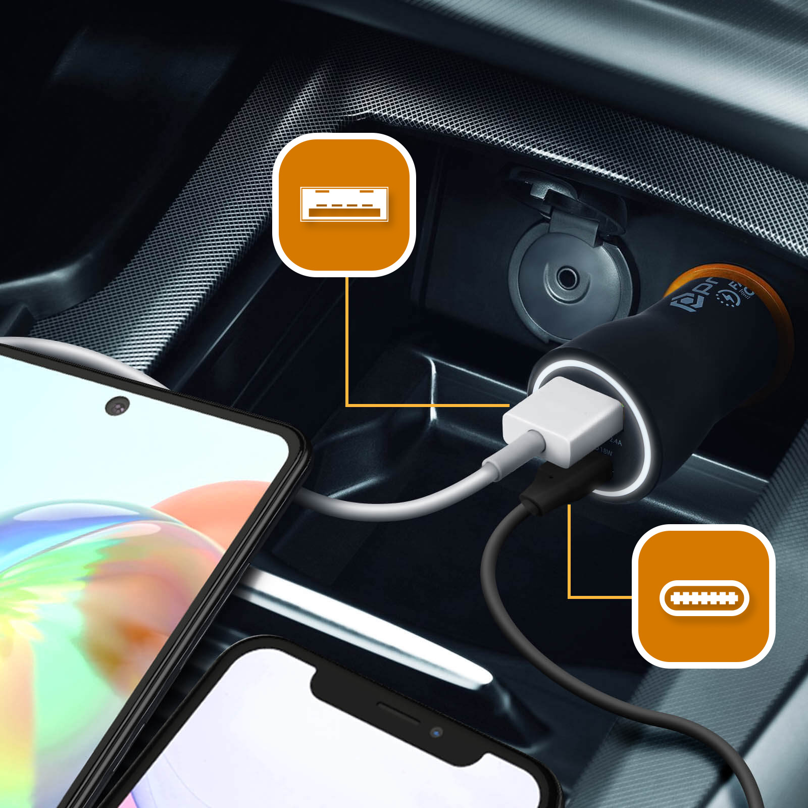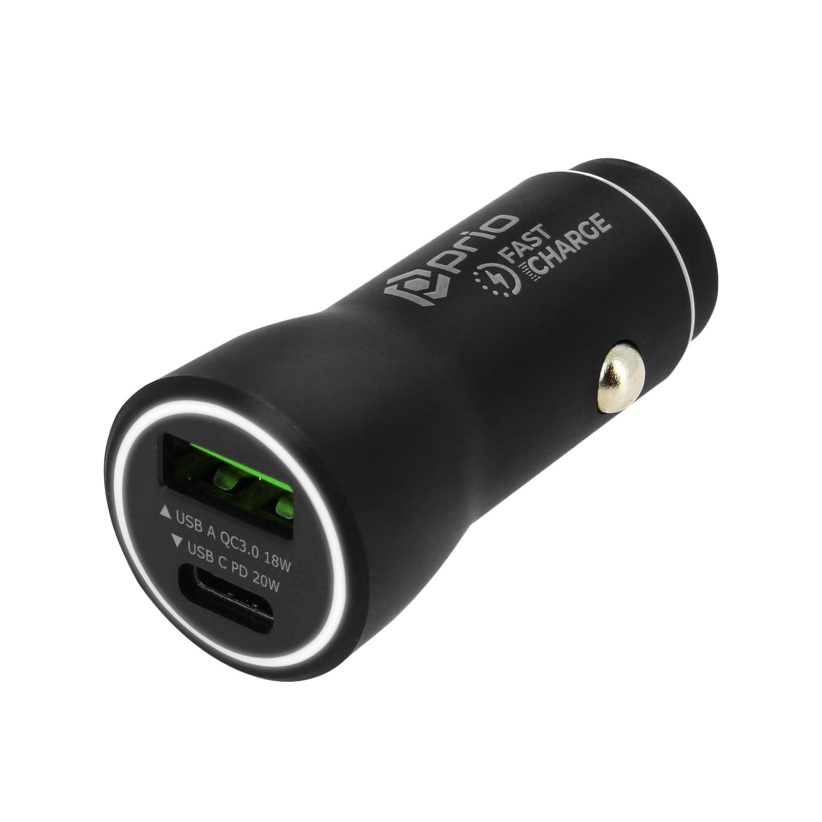 Chargeur allume-cigare de la marque Prio. Port USB + USB-C : recharger 2 appareils en même temps. Puissance de sortie 4.8A. Fast Charge + Power Delivery pour une recharge ultra-rapide. Format compact pour vous accompagner partout. Large compatibilité.