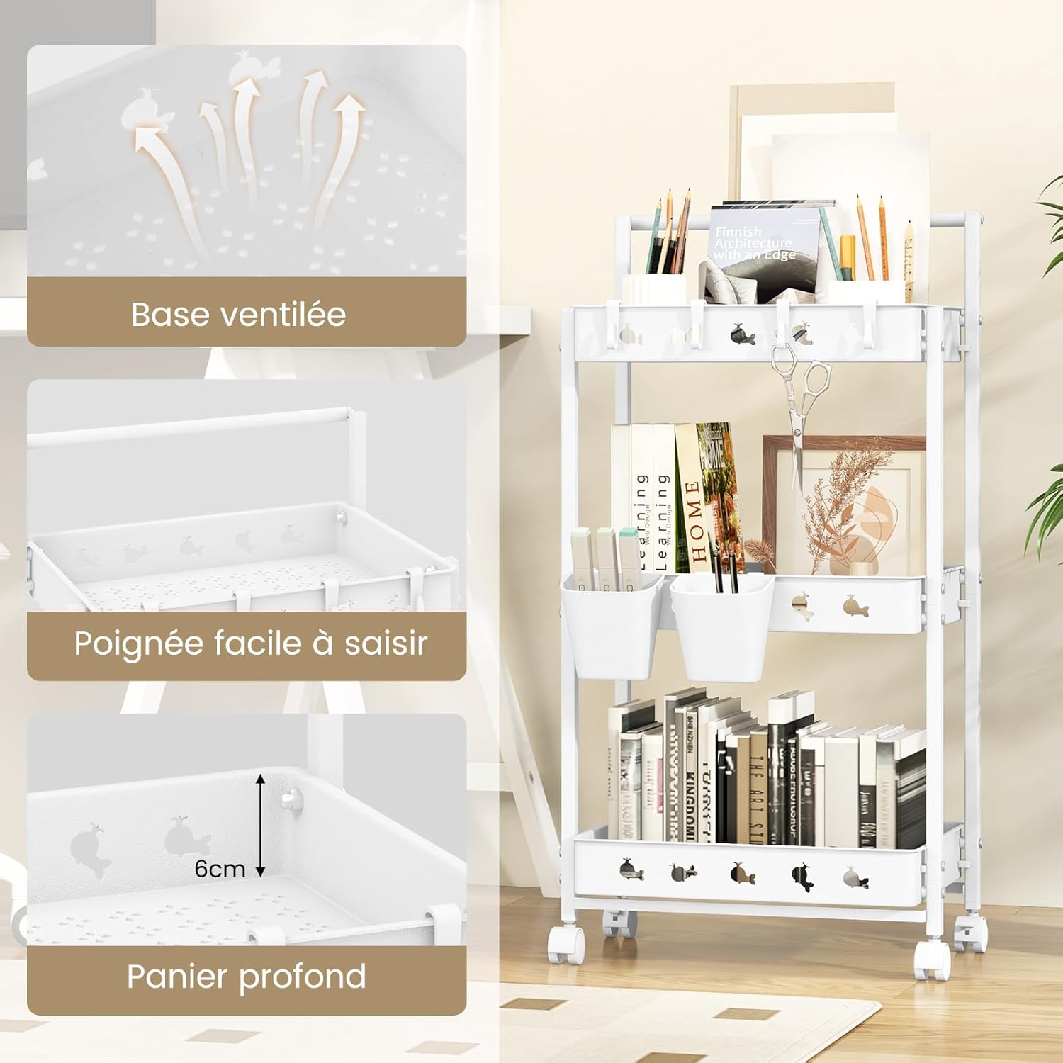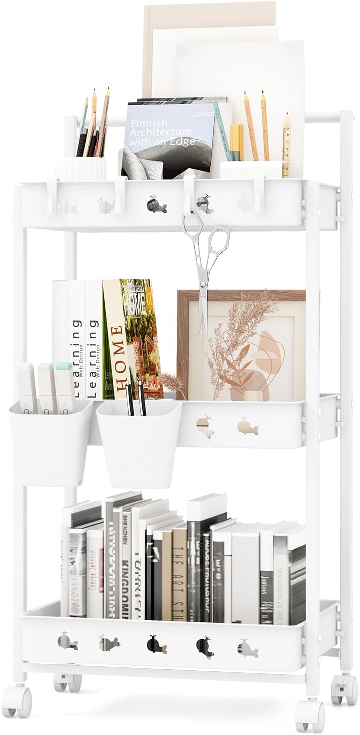 - Stockage Personnalisable : Doté de 3 niveaux horizontaux, de 4 crochets amovibles et de 2 bacs de rangement, vous pouvez personnaliser notre chariot utilitaire pour répondre à vos besoins uniques. Vos fournitures d'art, de maquillage, de livres ou d'ustensiles de cuisine seront bien rangées et faciles à repérer.