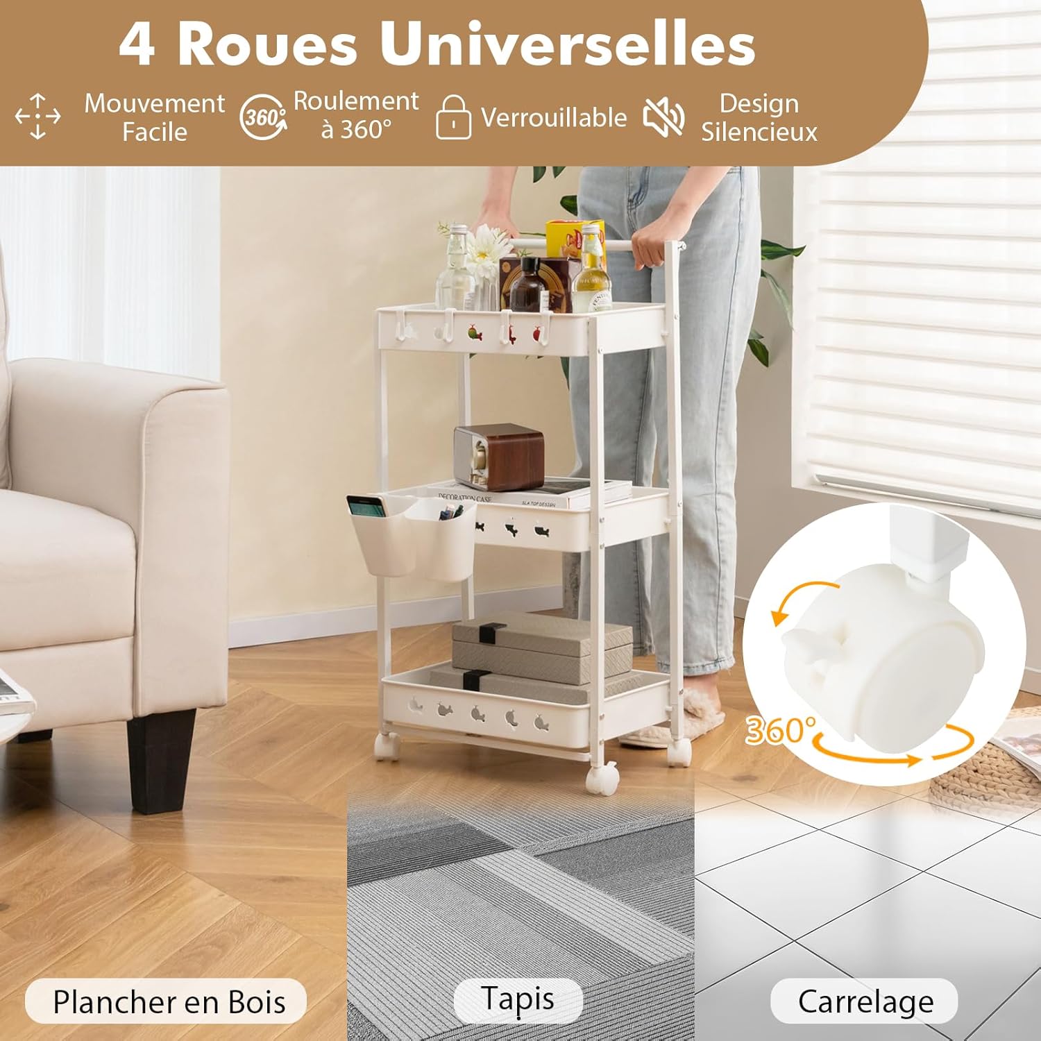 Chariot à roulettes à 3 niveaux, 4 roues universelles verrouillables, poignée, 2 bacs de rangement