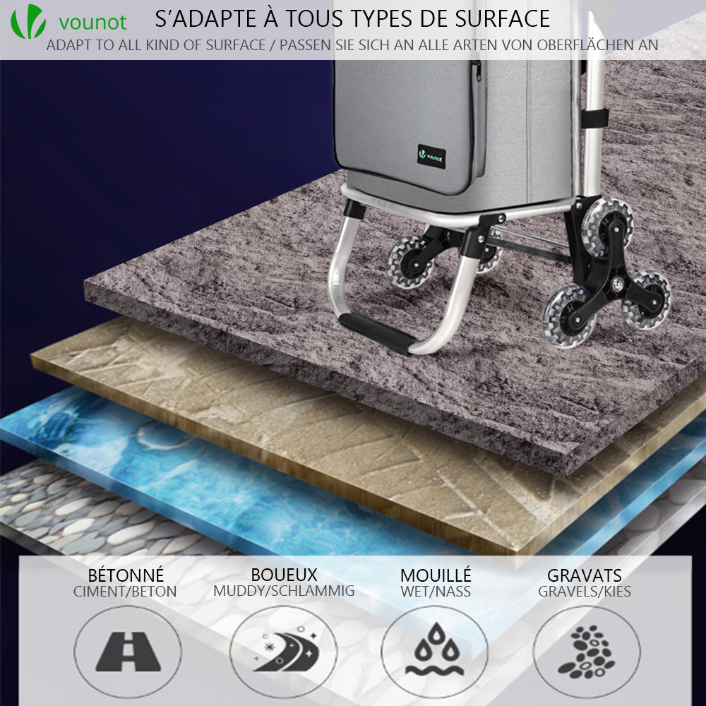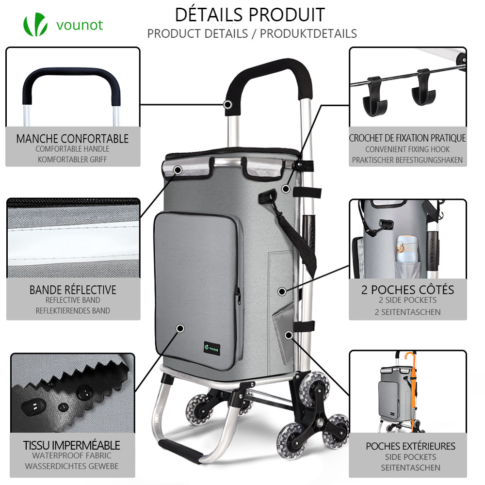 | Libellé | Chariot de course pliable monte escalier avec sac imperméable et crochets intégrés |