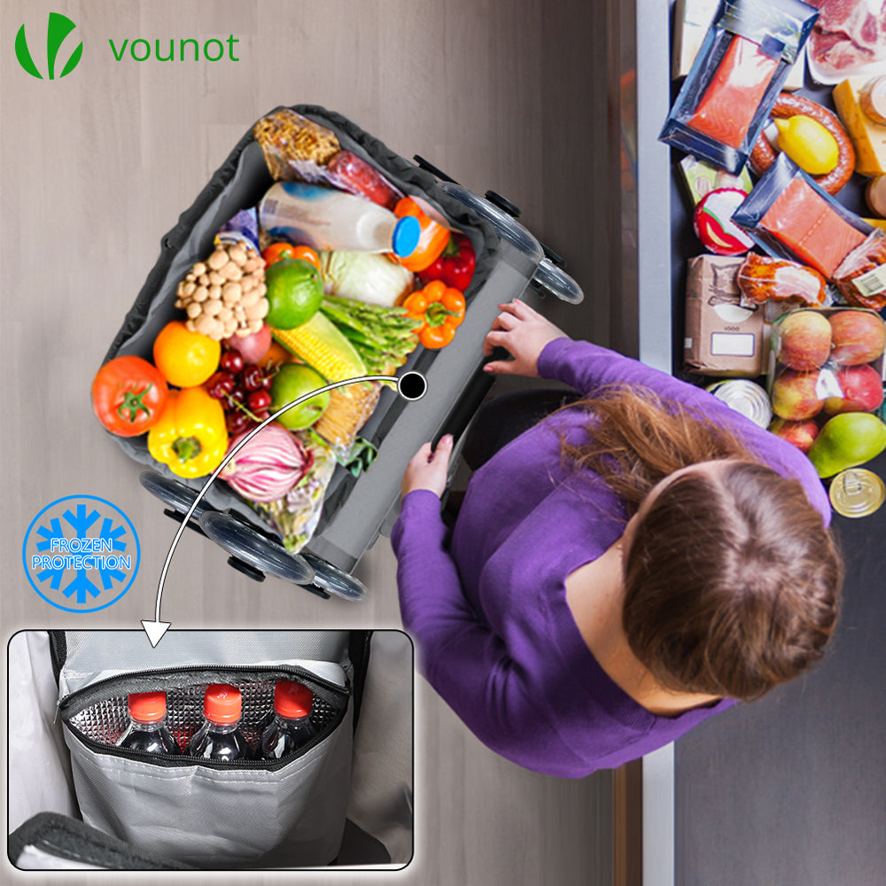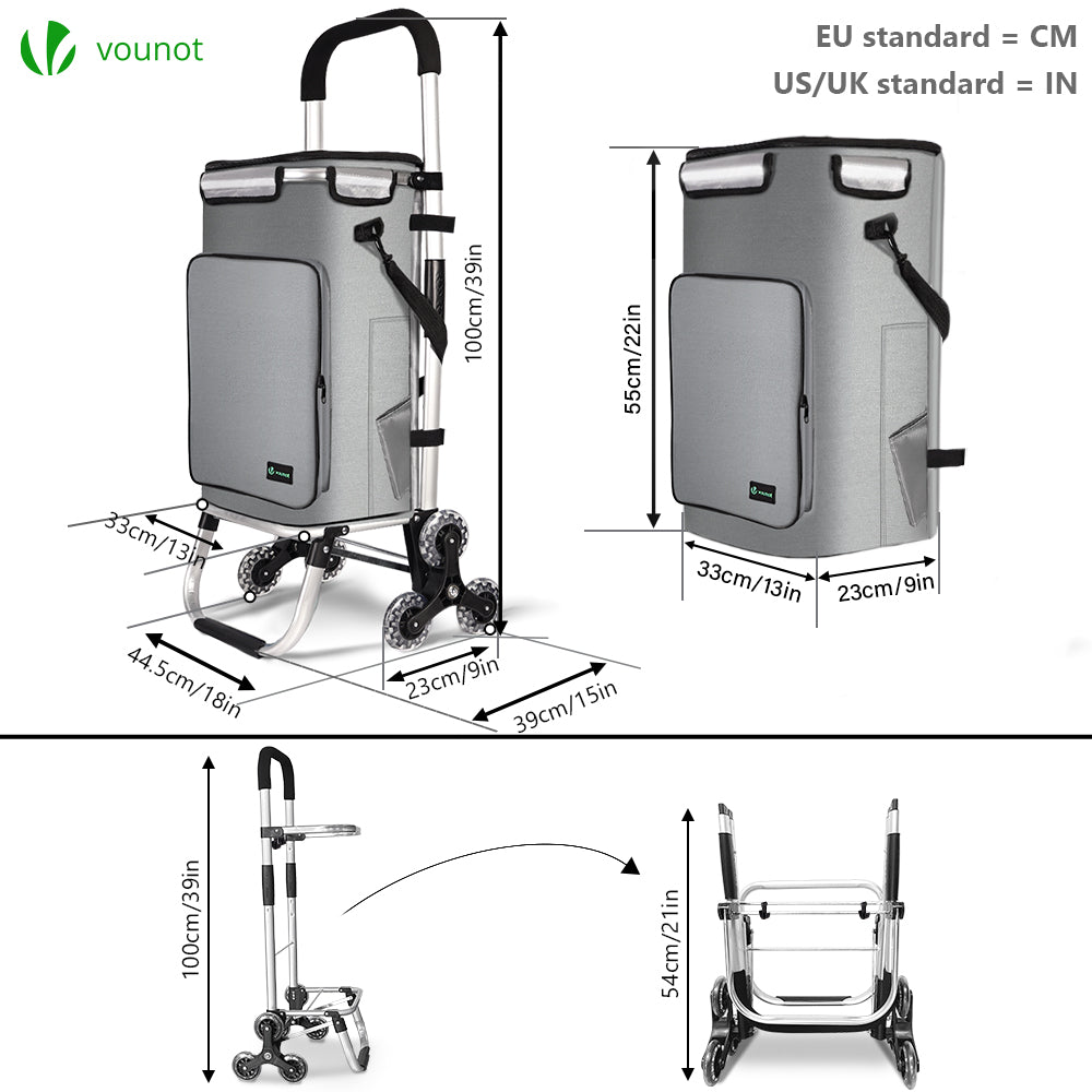 Le chariot de course pliable monte escalier de VOUNOT est l'accessoire parfait pour vos courses quotidiennes. Grâce à son système de 6 roues, vous pourrez facilement monter ou descendre les escaliers sans le moindre effort. Les roues sont fabriquées en matériau de haute qualité offrant une excellente résistance à l'usure et un déplacement silencieux. Le chariot est doté d'un sac de rangement spacieux et imperméable, avec un petit sac isotherme intégré pour maintenir vos produits frais. Il peut supporter jusqu'à 40kg de cartons empilés, boîtes ou autres grâce à son cadre aluminium robuste. En plus d'être un chariot de course, il peut être utilisé comme un diable. Avec une poignée en mousse confortable et des bandes réflectives sur le sac pour une meilleure visibilité dans l'obscurité, le chariot est facile à déplacer. De plus, il est facile à ranger avec un cadre en aluminium qui se plie, un sac de rangement amovible et des roues qui peuvent se retirer. Le chariot est également équipé de deux crochets intégrés pour être fixé sur le devant d'un caddie de supermarché ou pour accrocher des sacs plastiques. Les dimensions du sac sont d'environ 33*23*55 cm et celles du cadre sont d'environ 44.5*39*100 cm. Le poids du chariot est d'environ 3kg et il est fabriqué en polyester et en aluminium. Optez pour le chariot de course pliable monte escalier de VOUNOT pour faciliter vos courses au quotidien.