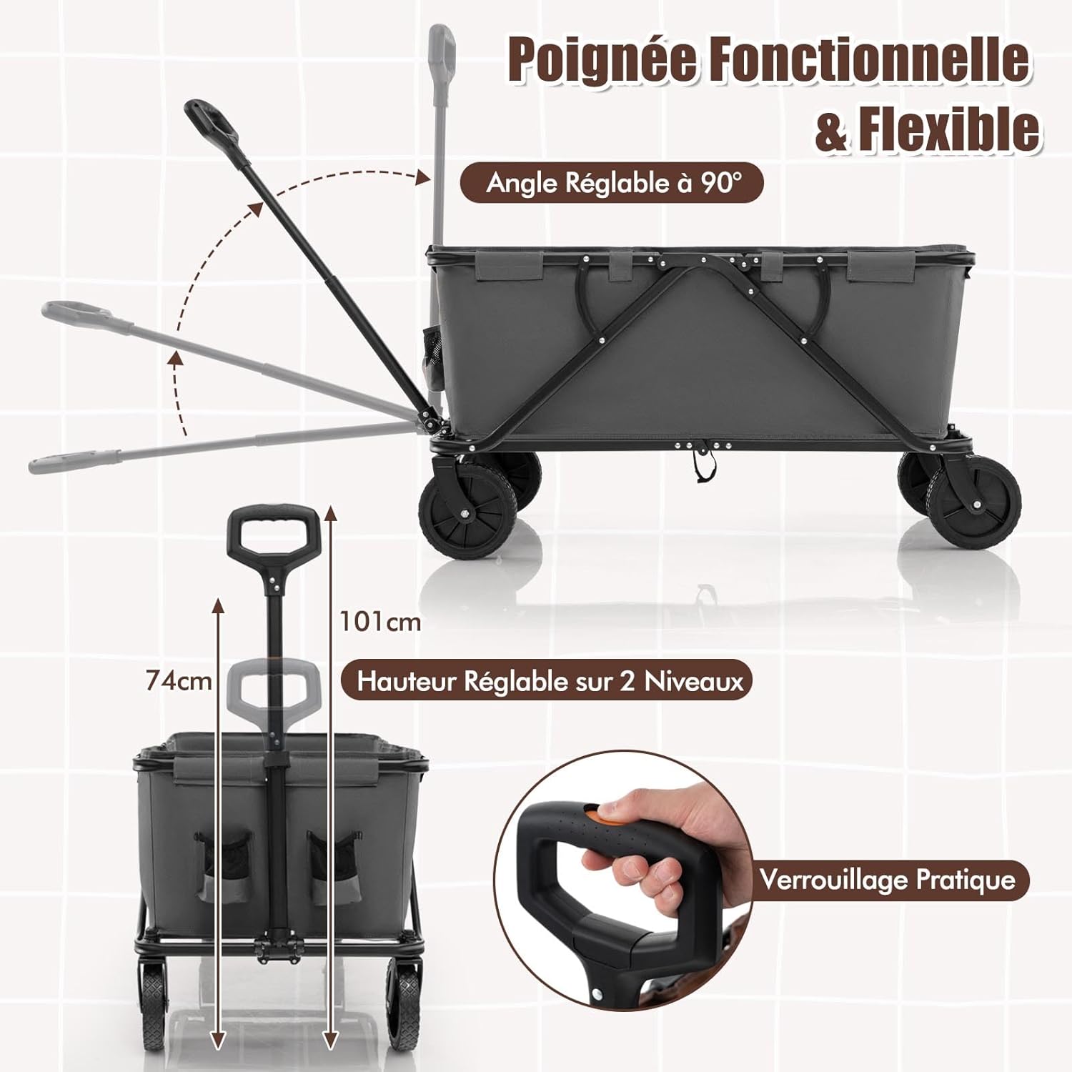 | Libellé | Chariot de plage pliable à roulettes, avec guidon réglable, porte-bouteilles et poche de rangement, gris |