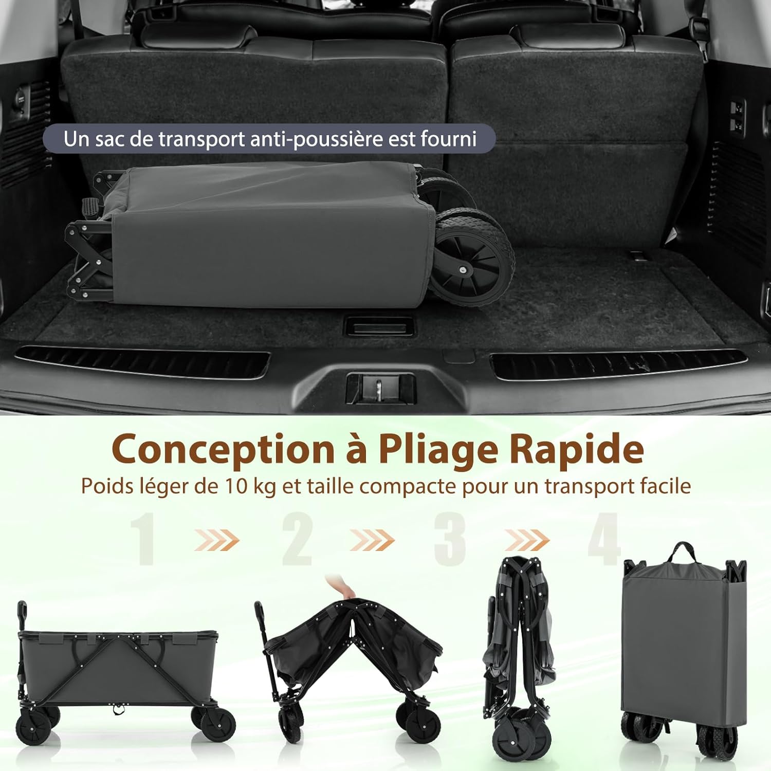 - # 𝐂𝐨𝐧𝐜𝐞𝐩𝐭𝐢𝐨𝐧 𝐏𝐥𝐢𝐚𝐛𝐥𝐞 𝐞𝐭 𝐏𝐨𝐫𝐭𝐚𝐛𝐥𝐞 # Grâce à sa conception à pliage rapide, le chariot pliable peut être facilement rangé dans le sac de transport inclus pour un rangement ou un transport pratique. Cette fonctionnalité en fait un choix idéal pour les amateurs de plein air.
