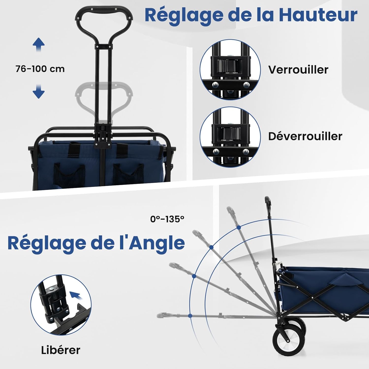 - Mouvement Facile : La poignée offre 5 réglages d'angle (0-135°) et deux réglages de hauteur (76-100 cm), s'adaptant ainsi mieux à votre taille et à l'environnement d'utilisation.