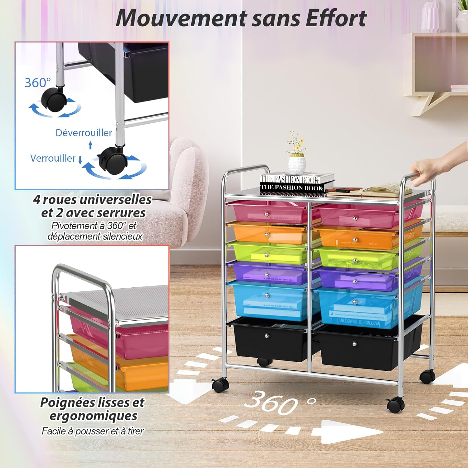 Chariot de rangement 12 tiroirs, tour de rangement à roulettes, cadre en acier, pour chambre, bureau
