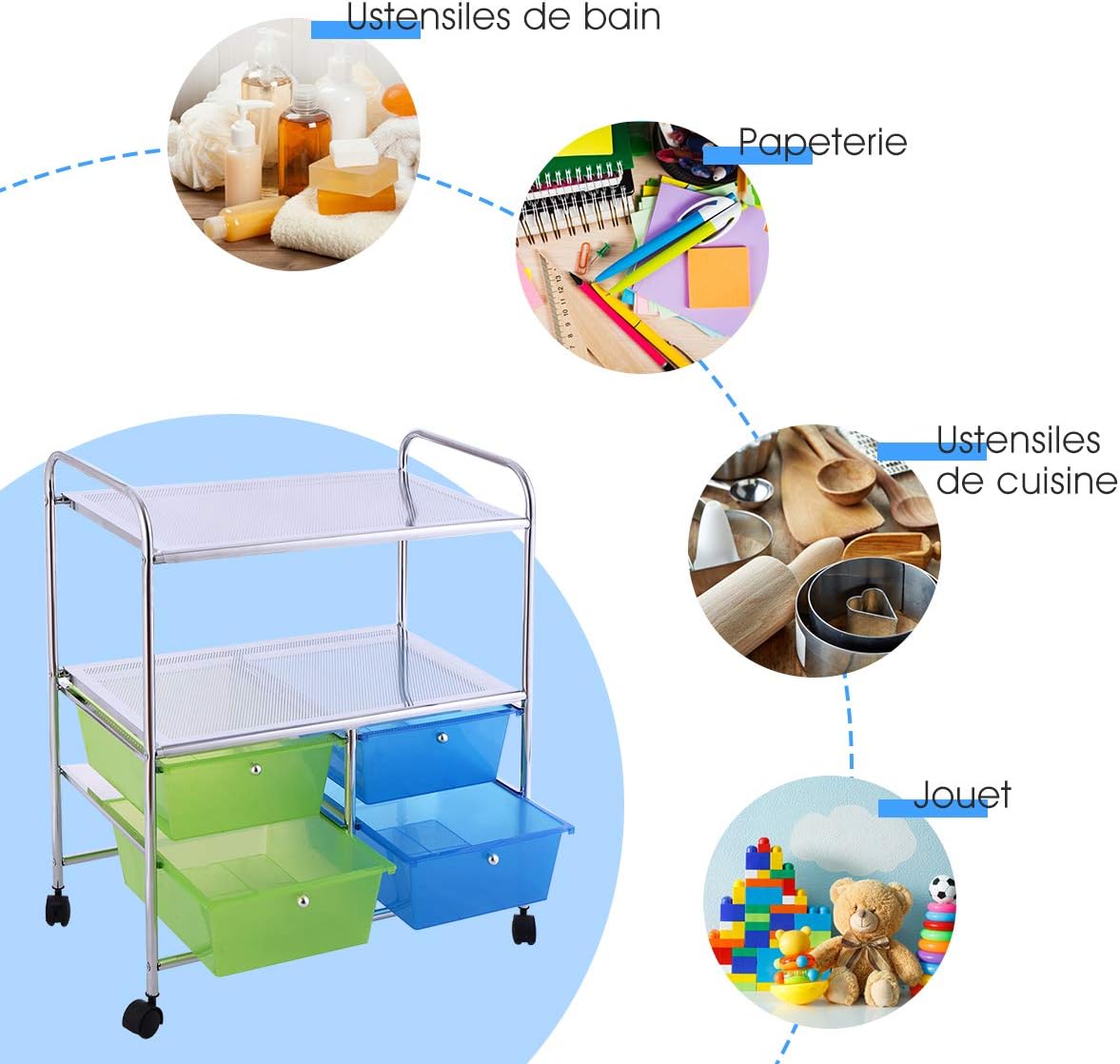 | Libellé | Chariot de rangement 3 niveaux avec 4 tiroirs, tour de rangement à roulettes, cadre en acier,bleu et vert |