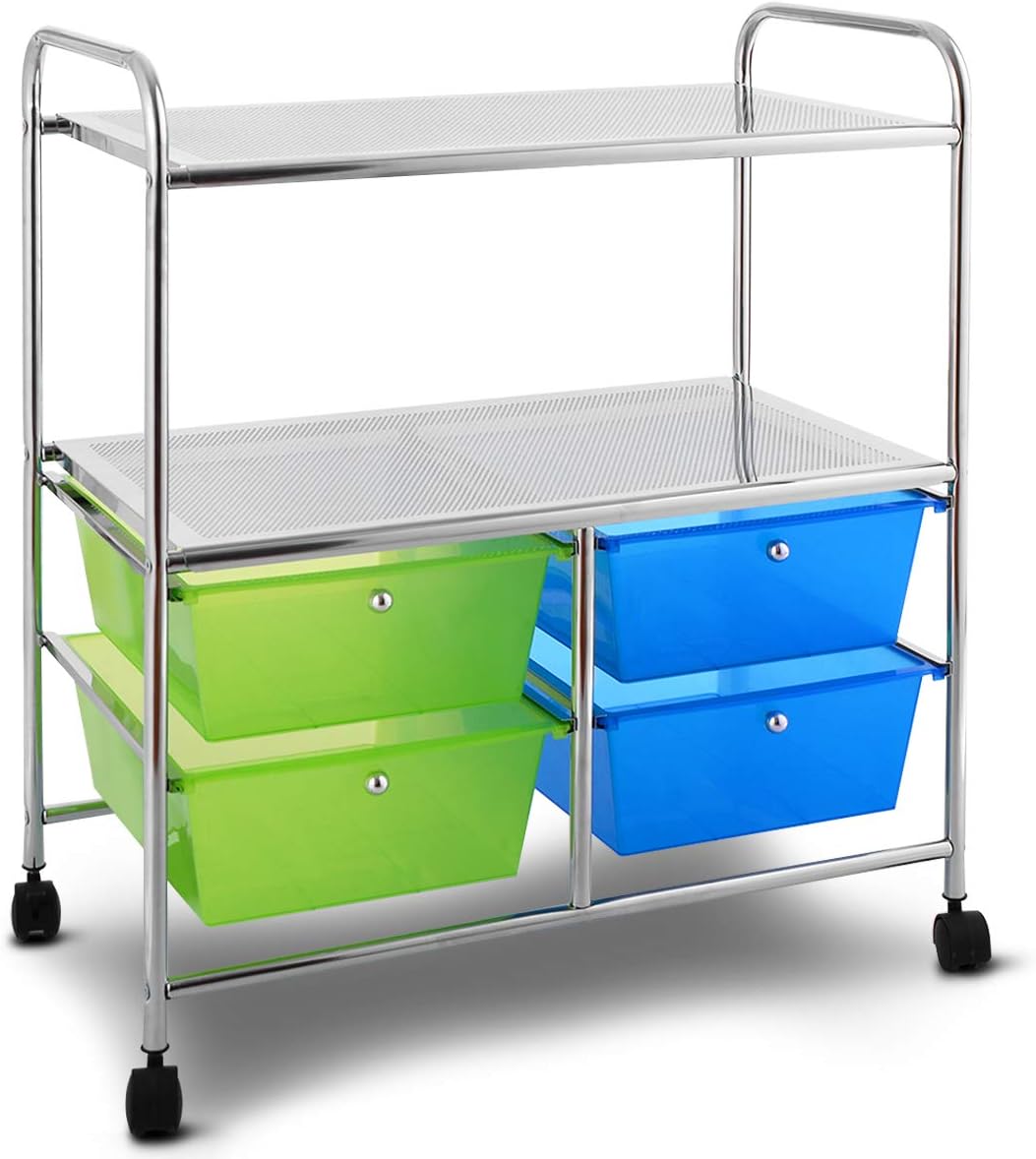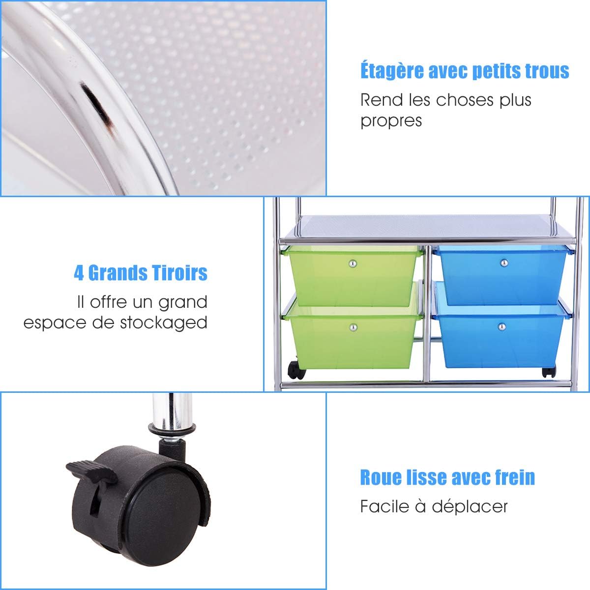 Chariot de rangement 3 niveaux avec 4 tiroirs, tour de rangement à roulettes, cadre en acier,bleu et vert