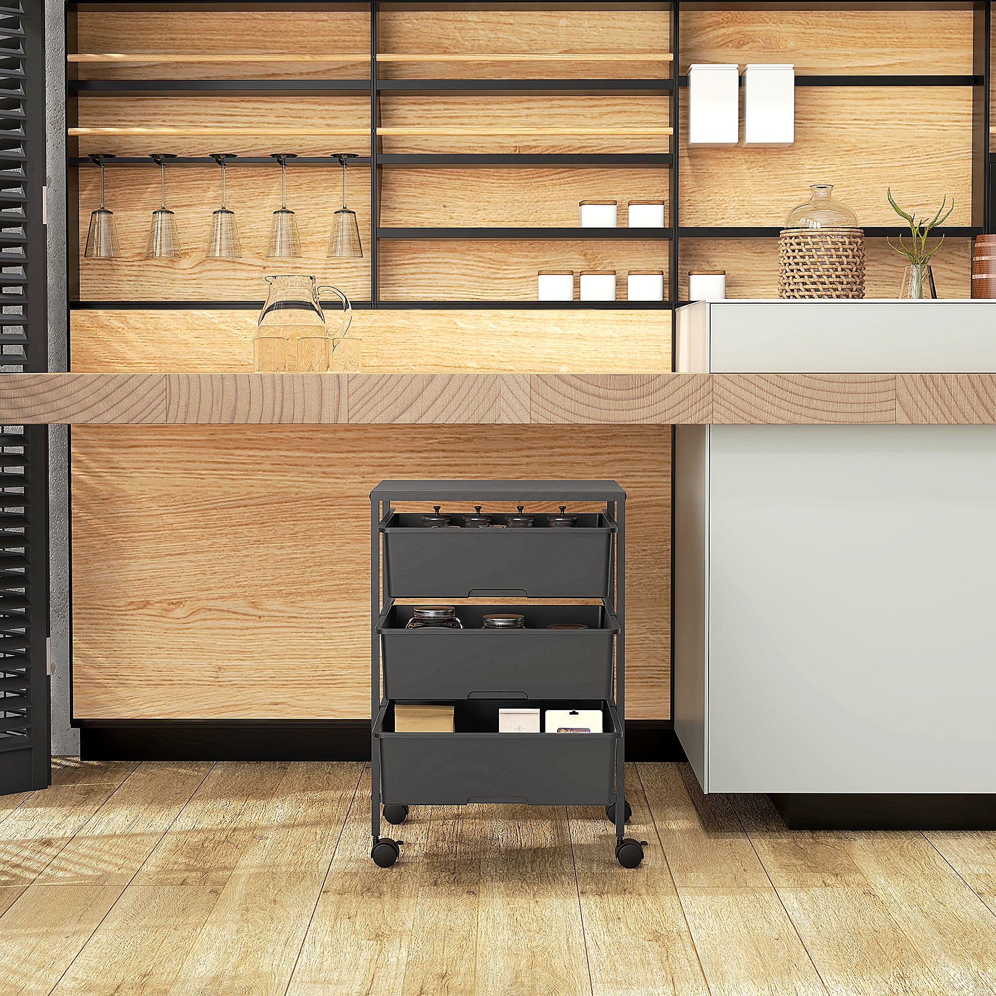 Explorez une vie sans encombrement avec le chariot de rangement HOMCOM. Doté de roues, il offre trois grands paniers pour une organisation méthodique de vos accessoires. Son design épuré et son cadre en acier laqué assurent un espace toujours organisé et élégant.