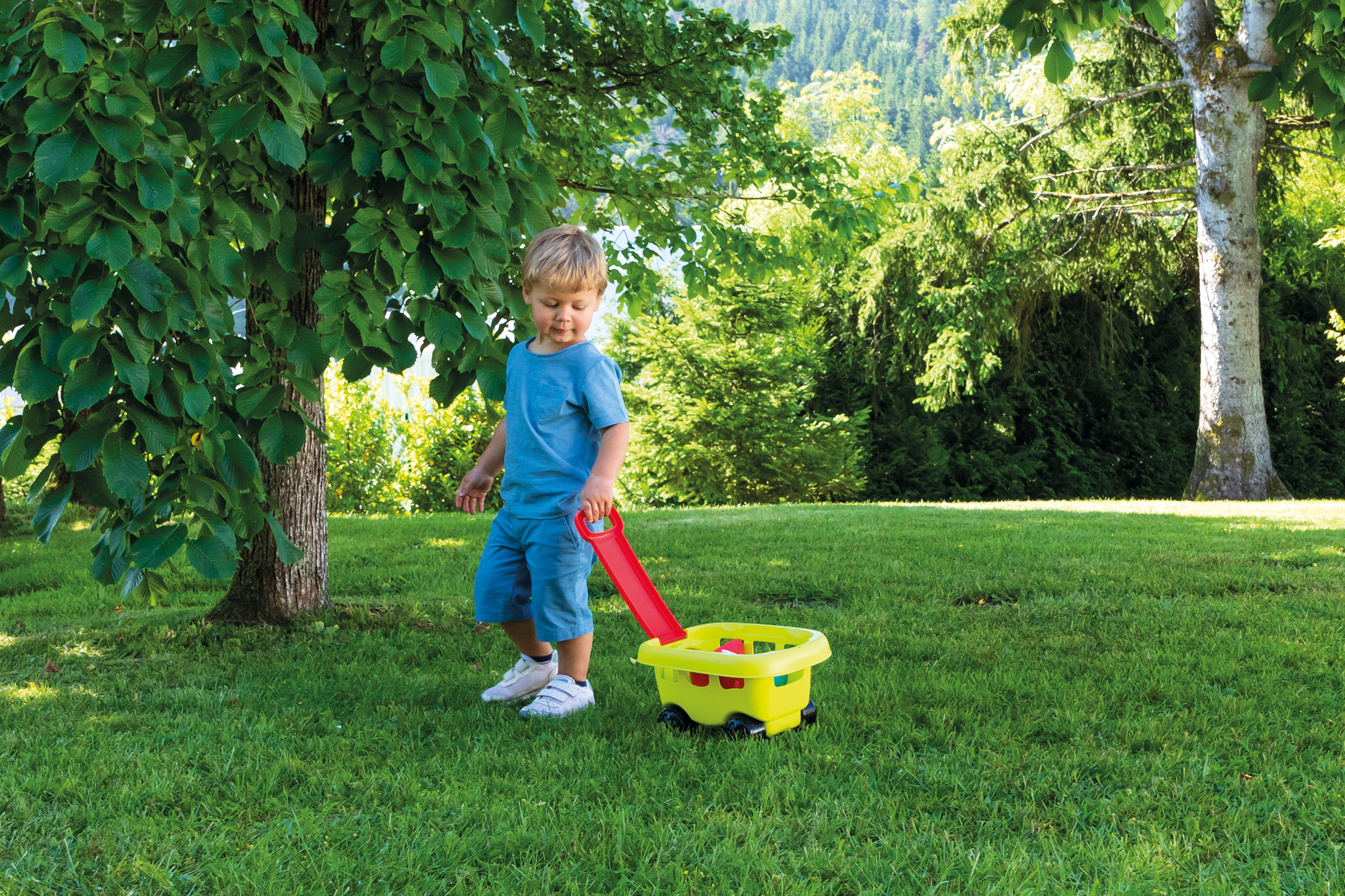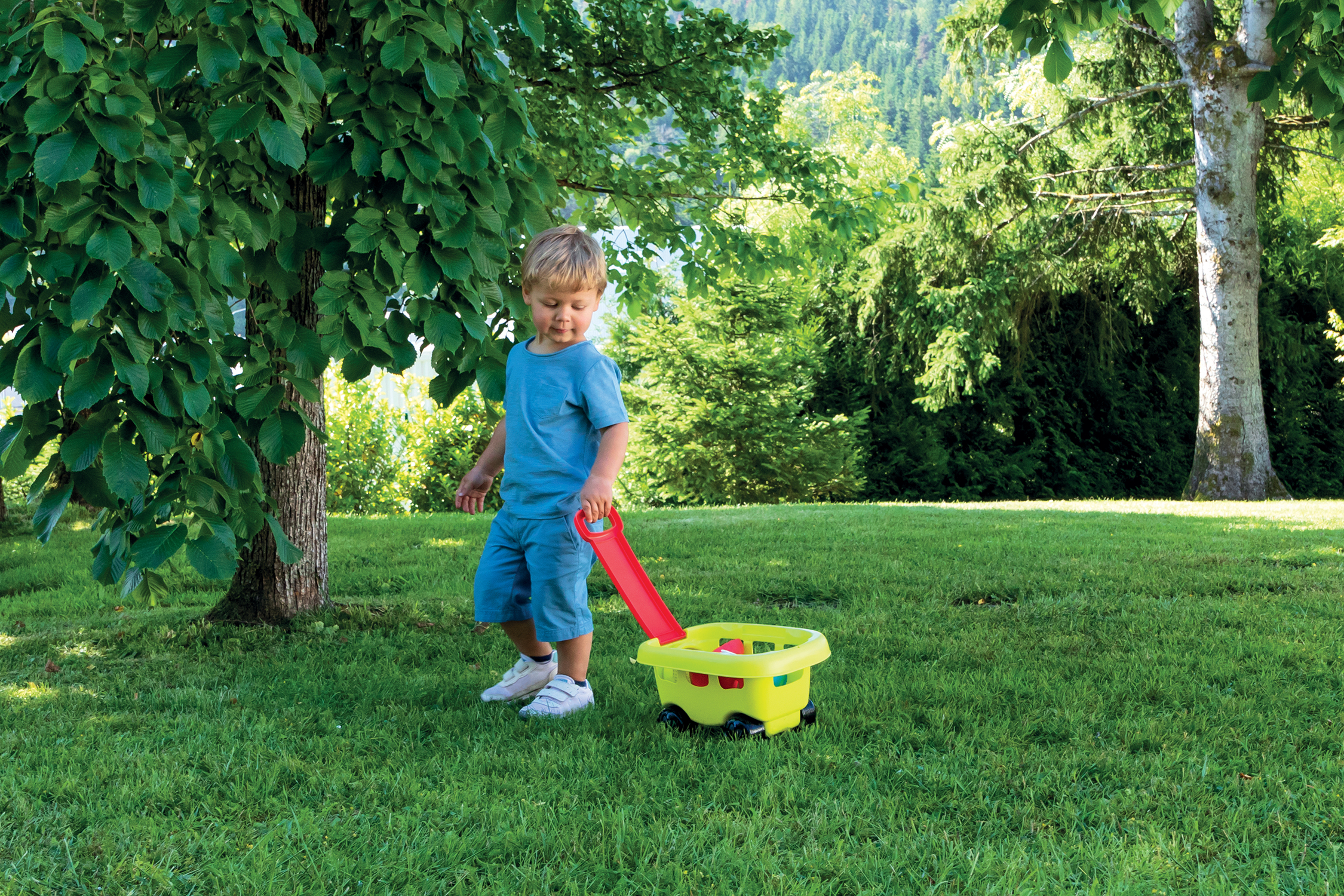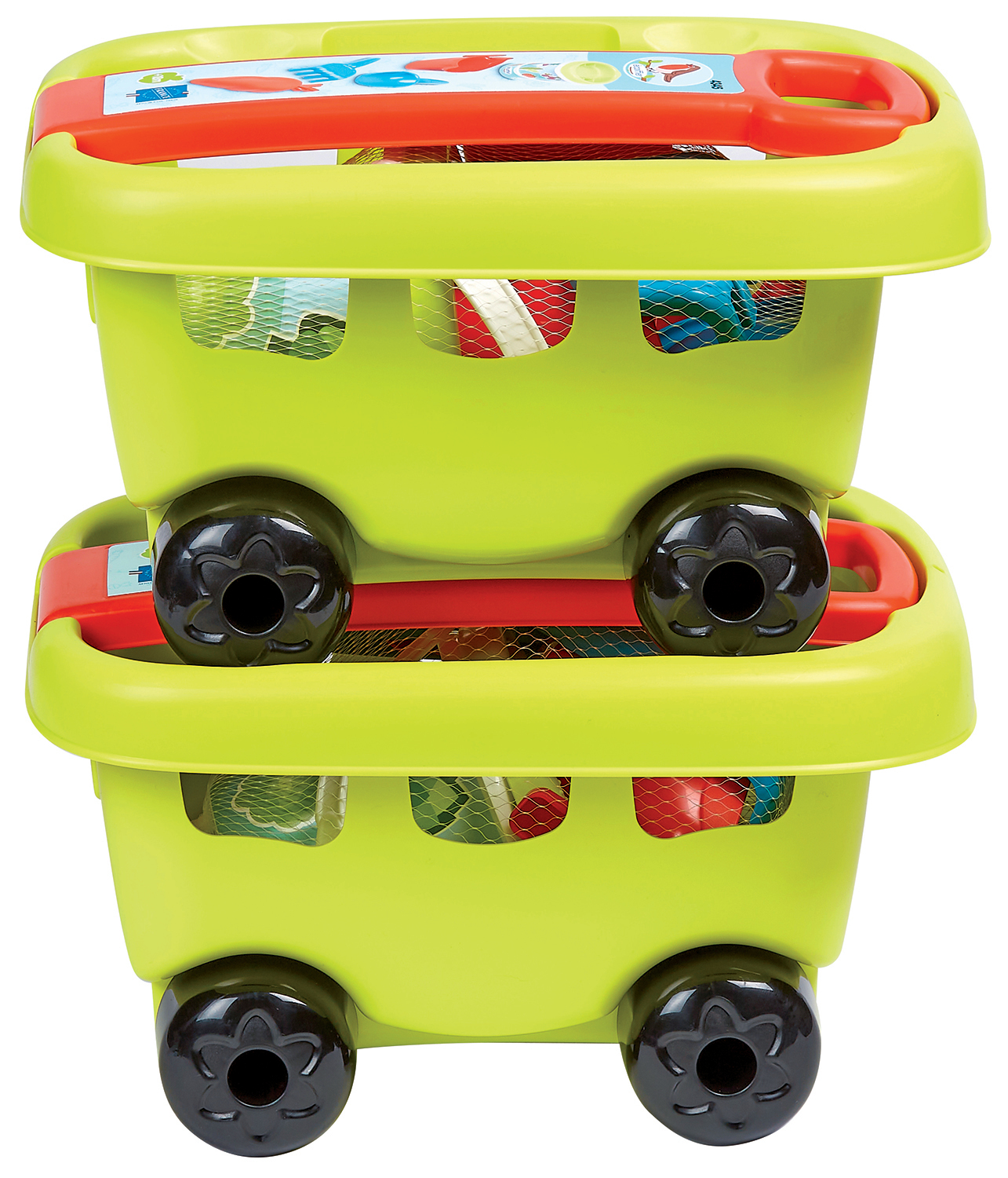 Ce chariot contient 1 seau décoré sur le thème des fruits et légumes, un tamis, un arrosoir, une pelle, un râteau et 1 moule à sable. Origine France Garantie. Conseillé dès 18 mois.