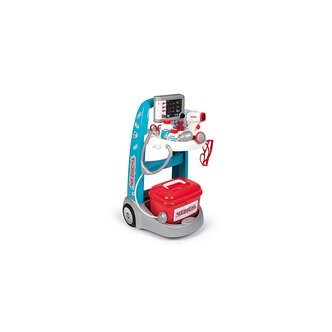 Avec ton chariot médical, tu vas pouvoir devenir un véritable médecin urgentiste ! Grâce aux roulettes tu pourras le transporter partout dans la maison ! Tu as tout à ta disposition pour soigner tes patients : 1 seringue, 1 thermomètre mécanique (vert, orange, rouge), 1 stéthoscope, 1 paire de ciseaux, 1 paire de lunettes, 1 otoscope, 1 marteau à réflexes, 2 flacons, 1 bracelet, 2 boites factices, 2 cartes médicales, des pansements autocollants, 1 thermomètre, et 1 vanity. Tu pourras également mesurer l’état de santé et les battements de cœur de tes patients grâce à ton équipement électronique ! Le vanity te permettra de transporter tout ton matériel médical et porter secours à tout moment !