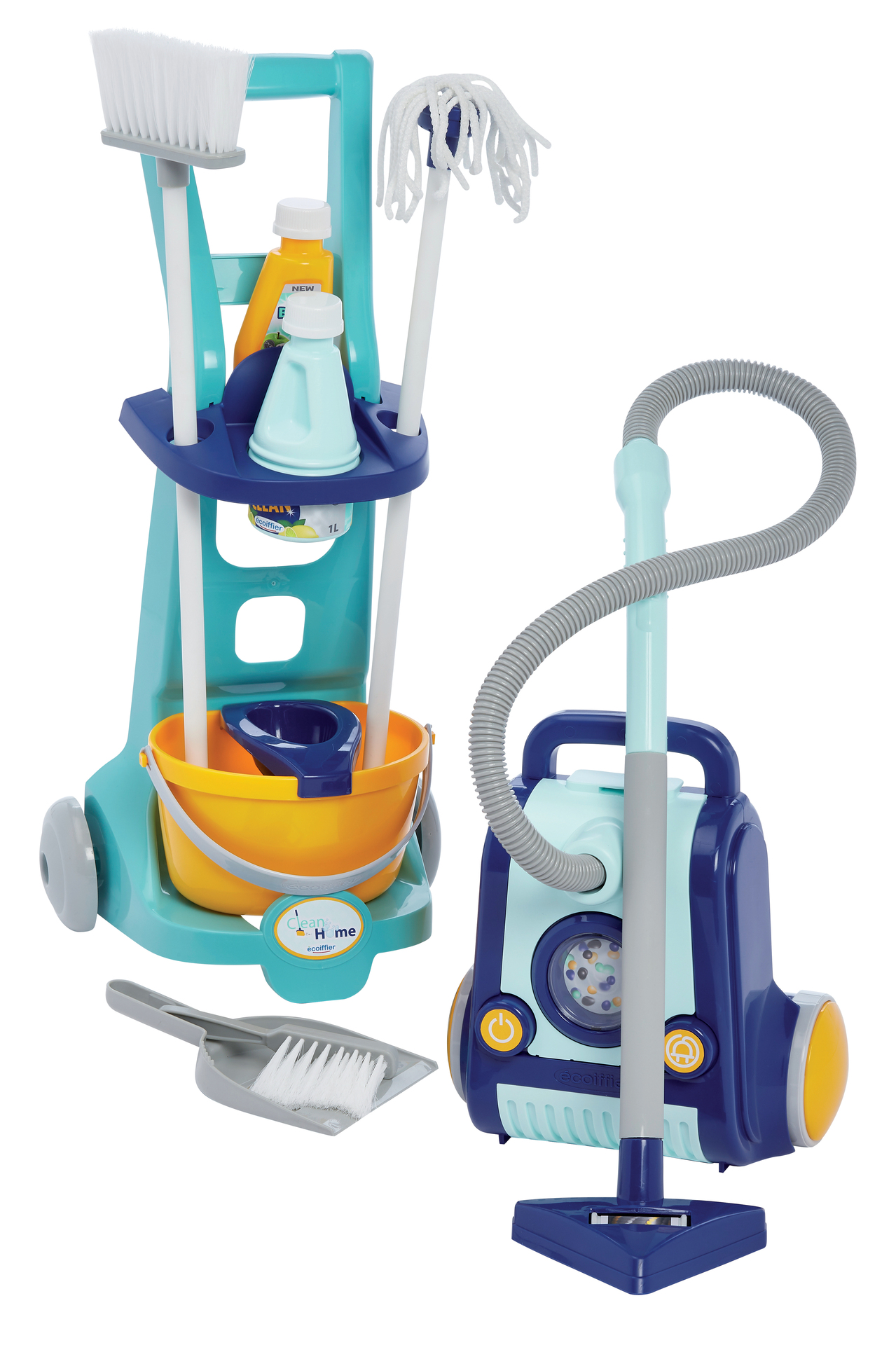 Un chariot regroupant tous les accessoires nécessaires pour une maison impeccable : un balai espagnol avec son seau équipé d’une essoreuse, un balai, une pelle et une balayette, 2 flacons de produits ménagers et un aspirateur traineau. 10 pièces Dès 36 mois. Origine France Garantie