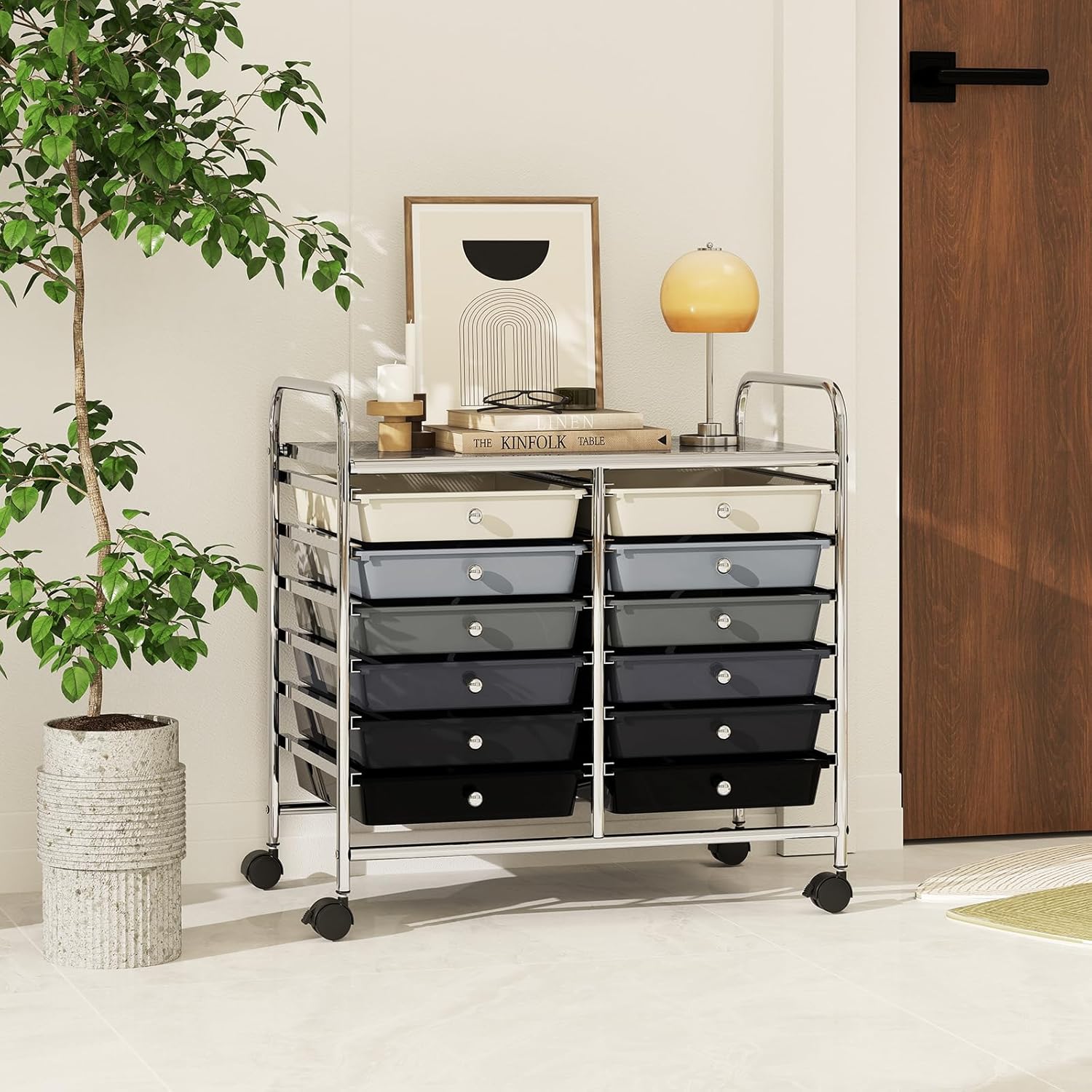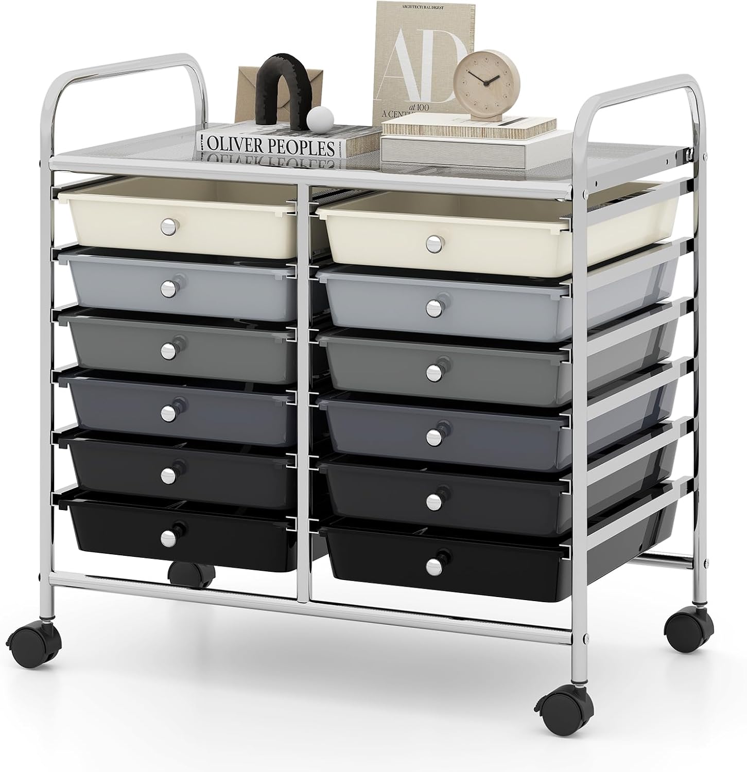 Chariot rangement 12 tiroirs amovibles pp,chariot à roulettes avec roues bloquantes poignées,blanc noir
