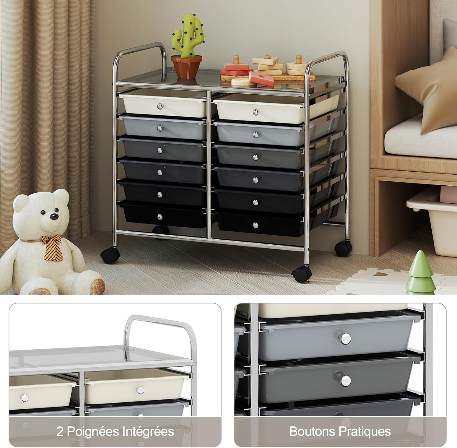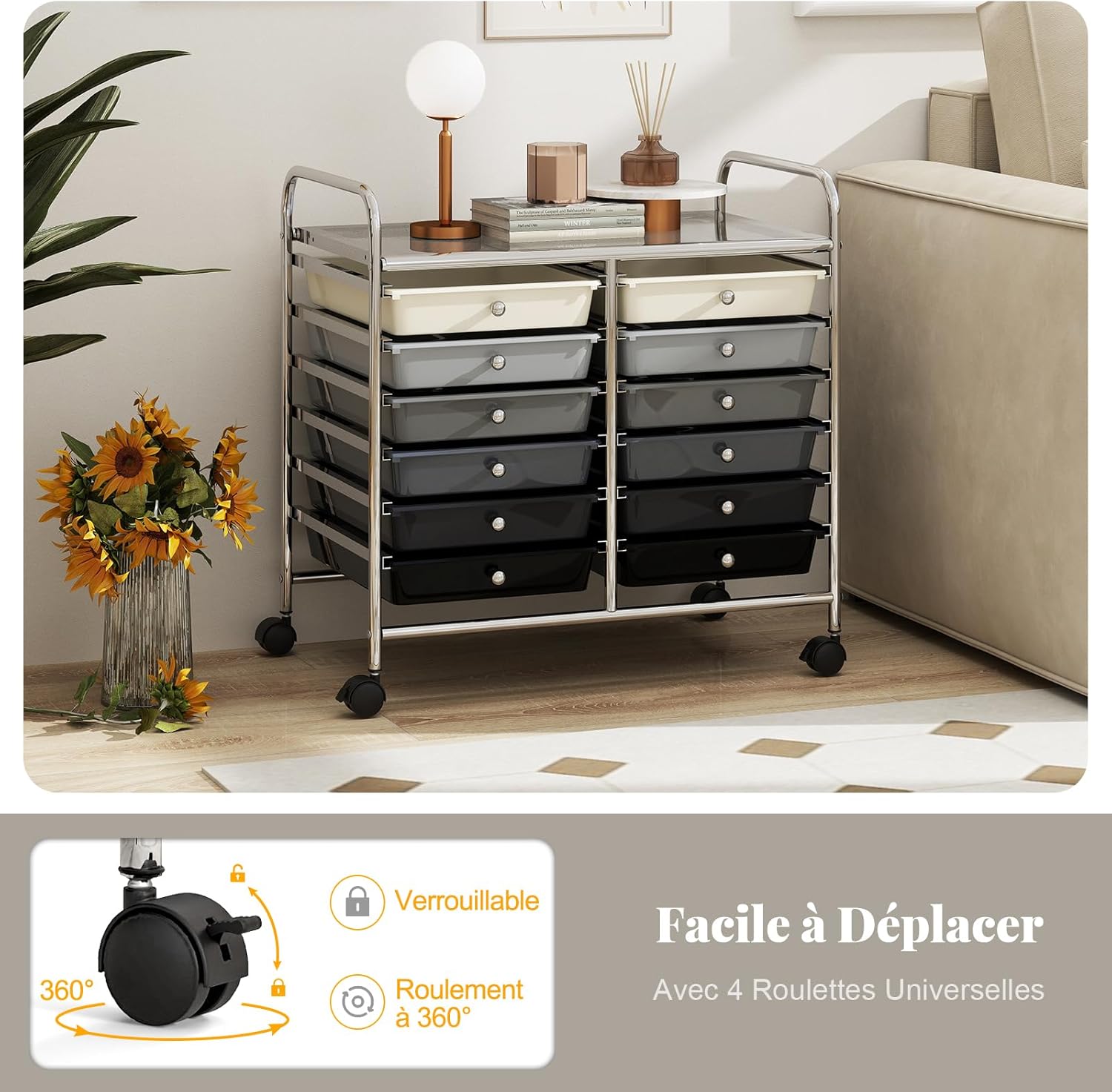 | Libellé | Chariot rangement 12 tiroirs amovibles pp,chariot à roulettes avec roues bloquantes poignées,blanc noir |