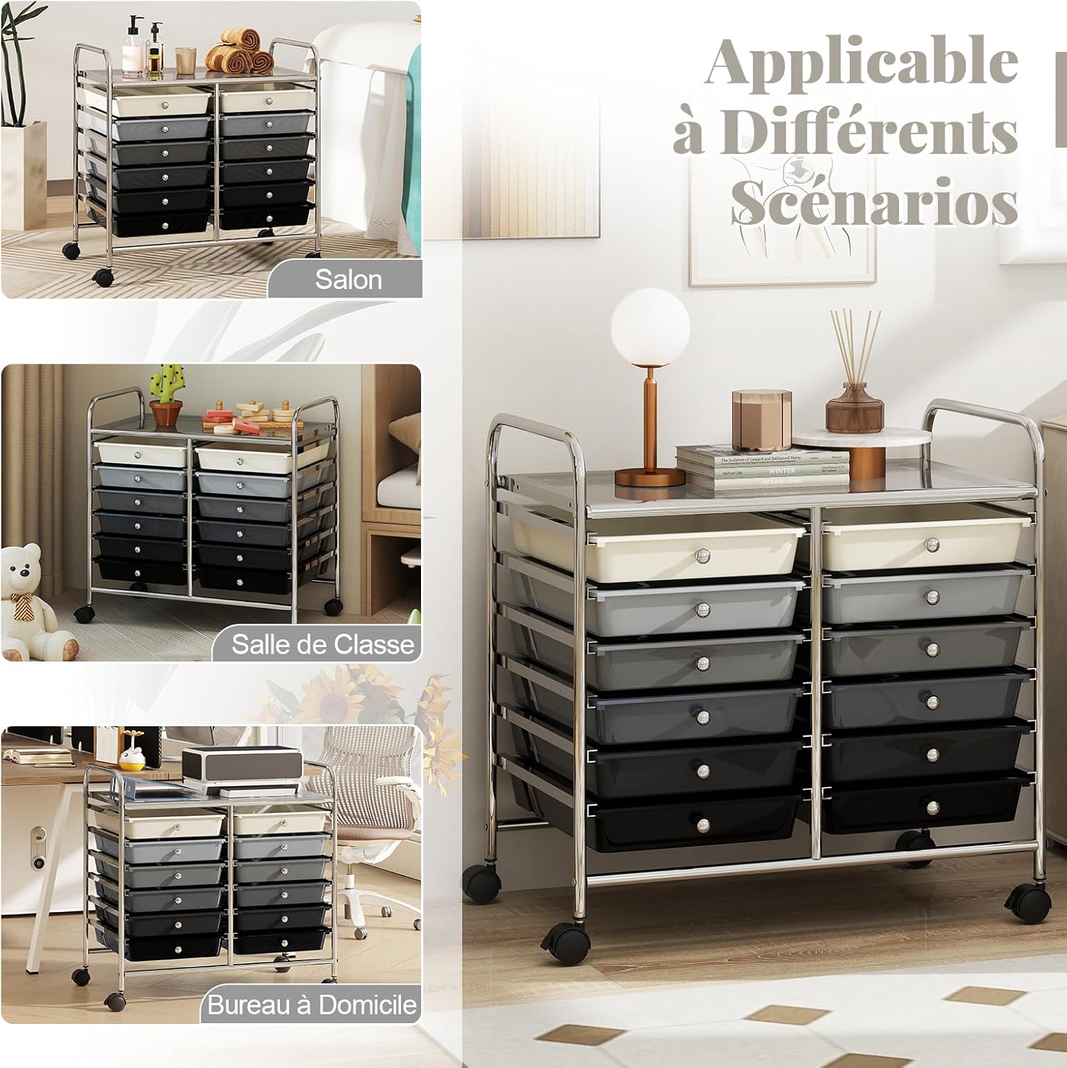 - Applicabilité à Divers Scénarios : Avec un design simple et polyvalent, ce chariot est adapté à divers scénarios, tels que salon, chambre d'enfant, salon de manucure, bureau etc. Il aide les utilisateurs à ranger rapidement les objets, améliorant ainsi le confort de vie et de travail.