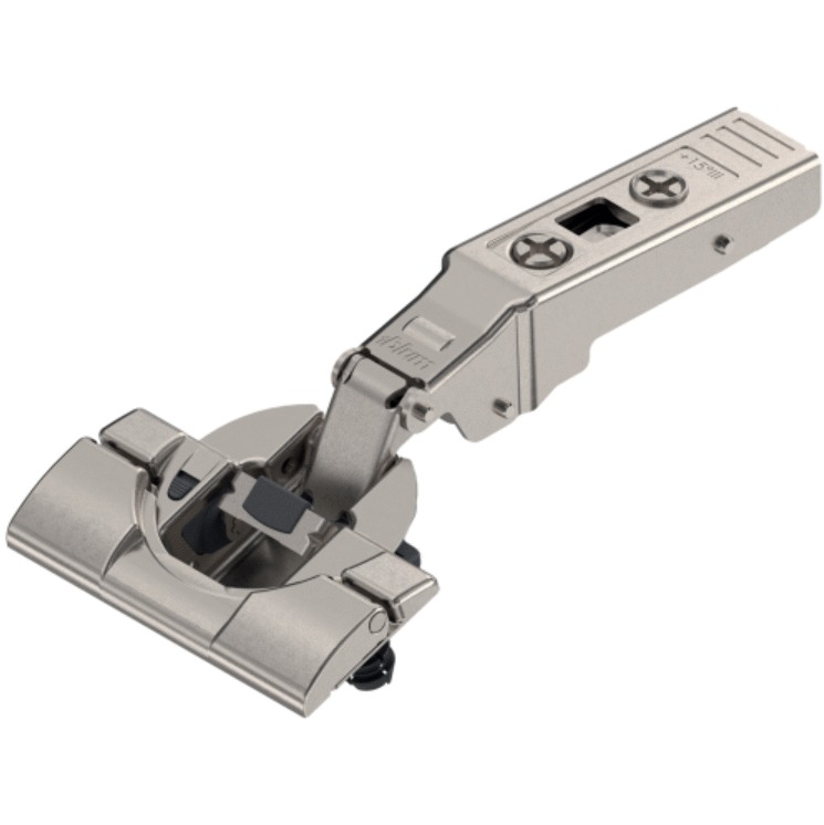 La charnière Clip Top de Blum pour portes sortantes à -45° est spécialement conçue pour les meubles d'angle avec faces décalées nécessitant des solutions spécifiques pour une utilisation efficace de l'espace et une accessibilité maximale. Grâce à son grand angle d'ouverture, cette charnière permet une ouverture plus large que les charnières standard, facilitant ainsi l'accès aux contenus du meuble.