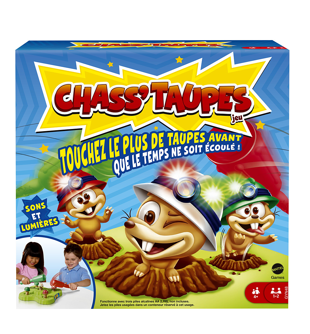 | Plus produit | Inspiré du célèbre jeu darcade, Chasstaupes permet de se défouler tout en jouant !\nLa règle est simple : taper sur les taupes lorsquelles sallument ! Si vous tapez dessus lorsquelles sont éteintes, vous perdez des points.\nLes enfants pourront se défouler tout en développant leur concentration et leur coordination il-main !\nSe joue seul ou à deux !\nLes enfants de 4 ans et plus vont adorer Chasstaupes, un jeu de rapidité complètement déjanté ! |