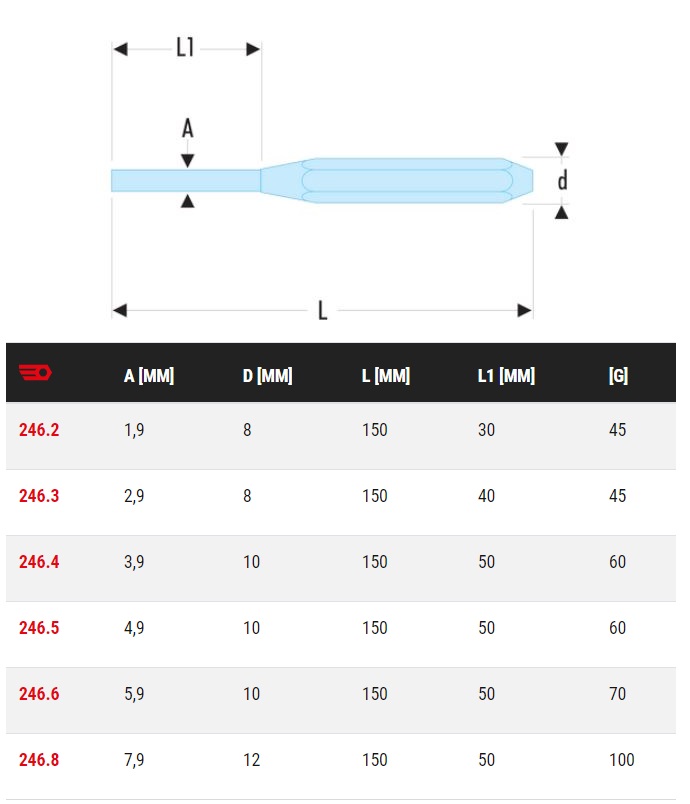 Ce chasse-goupille 246 est idéal pour les goupilles élastiques. L'épaulement de la tige permet de centrer efficacement l'outil sur les goupilles fendues. De plus, il bénéficie d'une dureté de 53 à 58 HRc selon les dimensions, garantissant une parfaite absorption de l'onde de choc.