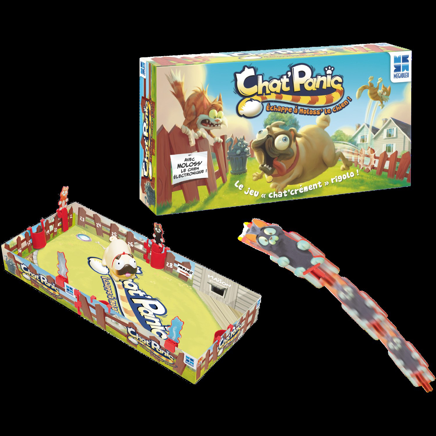 Lance les dés, et avance ton chat sur la barrière du jardin d’un ou plusieurs poteaux si le dé indique un chiffre. Attention ! Si le dé indique le chien, Moloss’ se met en chasse dans le jardin ! Pendant sa course folle, il va faire sauter tous les chats qui ne seront pas à l’abri dans un pot de fleurs ! Le 1er joueur qui réussit à faire le tour complet du jardin a gagné. Un jeu d’action et de rapidité chat’crément rigolo avec un chien électronique chasseur de chats !