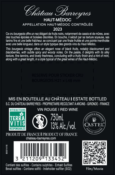 | Libellé | Château Barreyres, 2023 - Haut-Médoc AOP - Rouge - 75 cl |