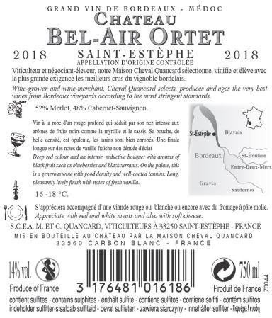 | Libellé | Château Bel-Air Ortet, 2018 - Saint-Estèphe A.O.C. - Rouge - 75 cl |