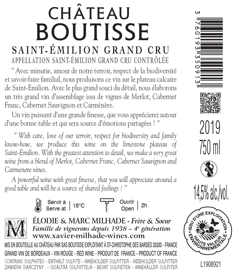 | Libellé | Château Boutisse, 2019 - Saint-Emilion Grand Cru AOC - Rouge - 75 cl |