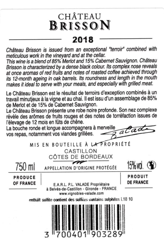 | Libellé | Château Brisson, 2018 - Castillon Côtes de Bordeaux AOP - Rouge - 75 cl |