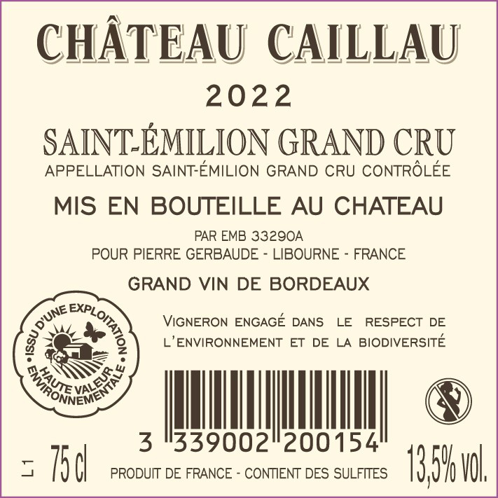 Libellé Château Caillau, 2022 - Saint-Emilion Grand Cru AOP - Rouge - 75 cl