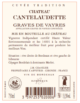 | Libellé | Château Cantelaudette, 2022 - Graves de vayres AOP - Rouge - 75 cl |