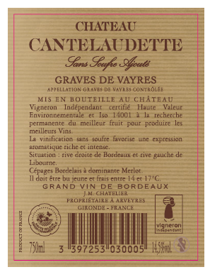 | Libellé | Château Cantelaudette, 2022 - Graves de vayres AOP - Rouge - 75 cl |