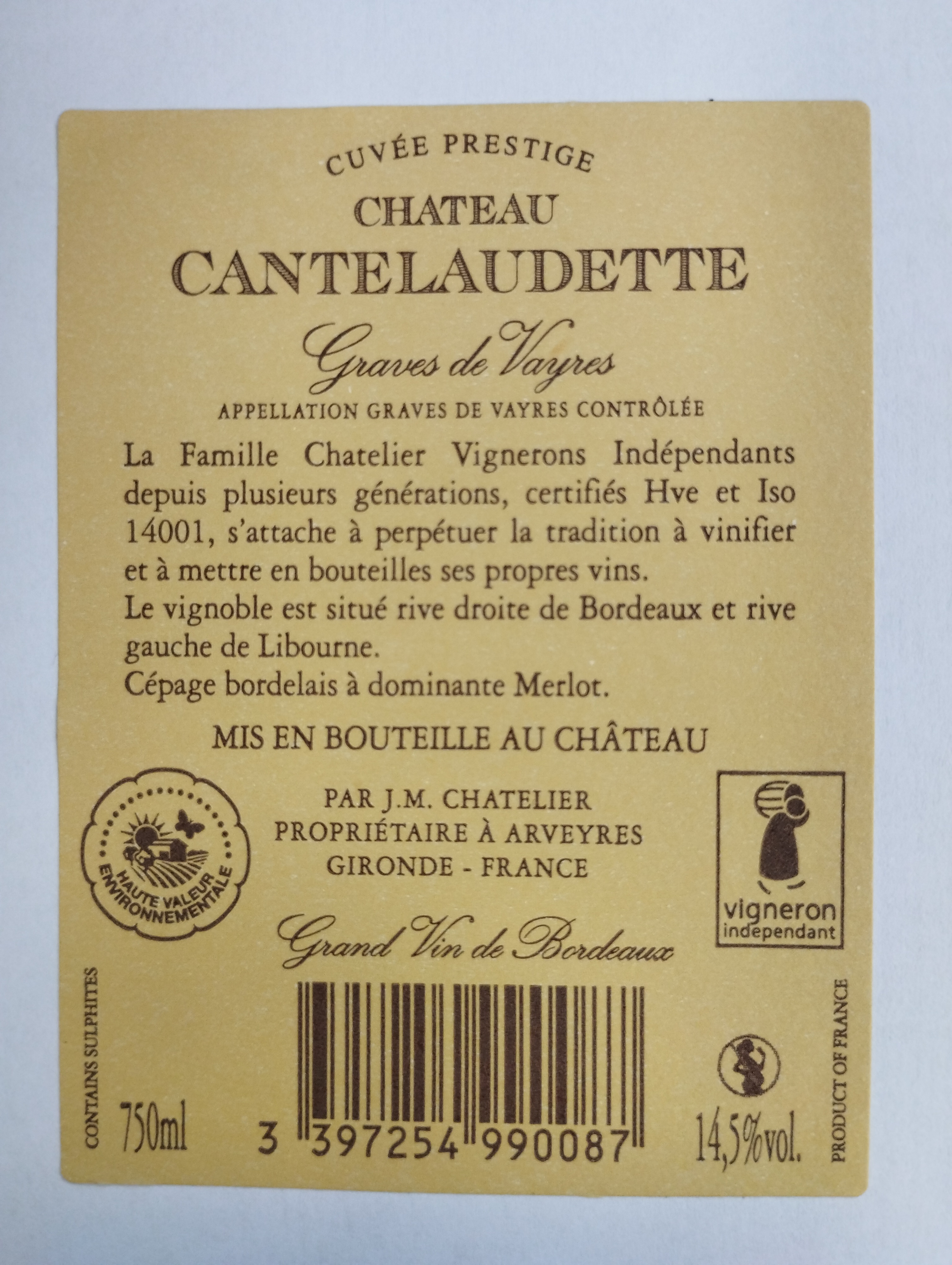 | Libellé | Château Cantelaudette Cuvée Prestige, 2020 - Graves de Vayres AOP - Rouge - 75 cl |