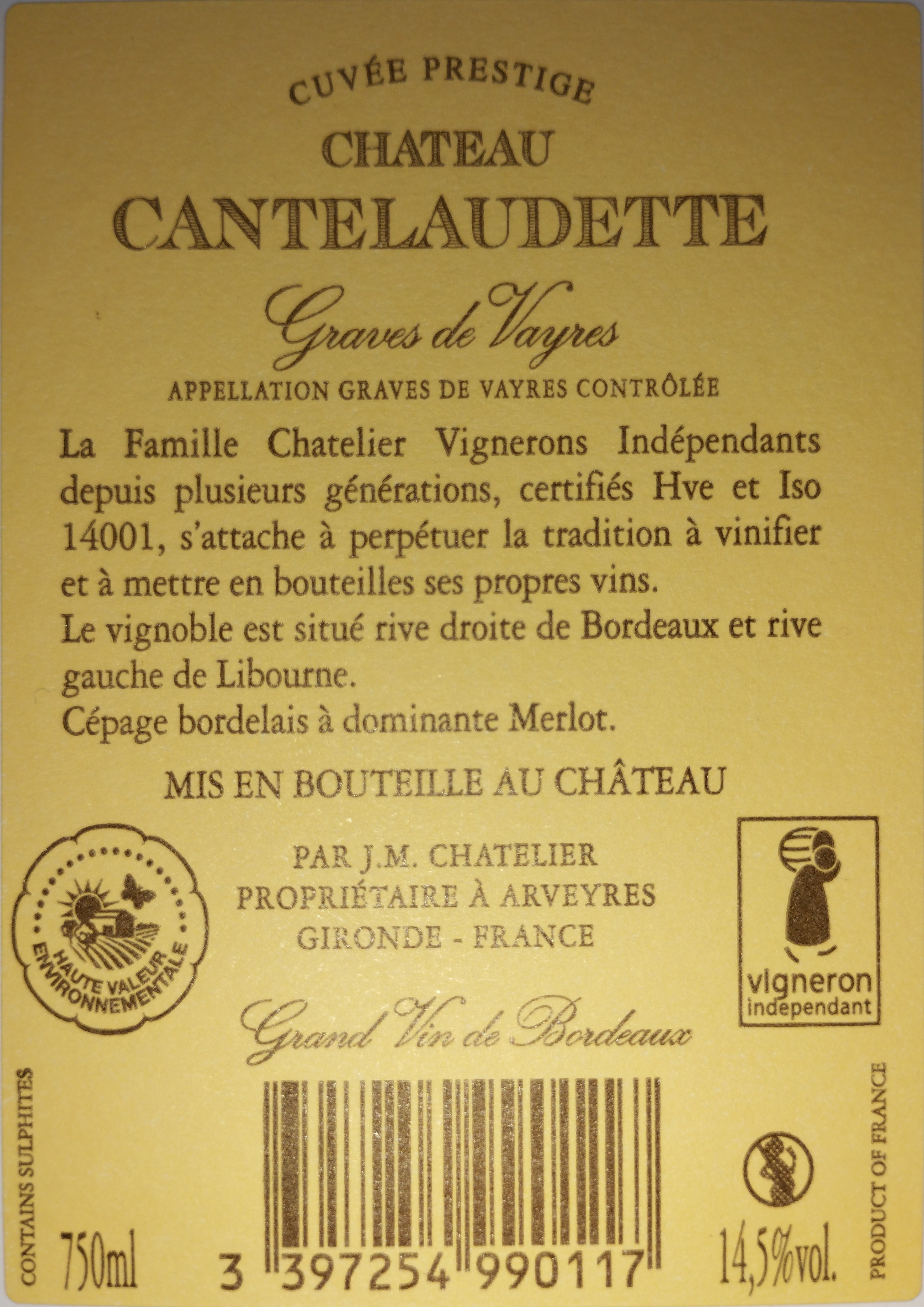 Libellé Château Cantelaudette Cuvée Prestige, 2022 - Graves de vayres AOP - Rouge - 75 cl