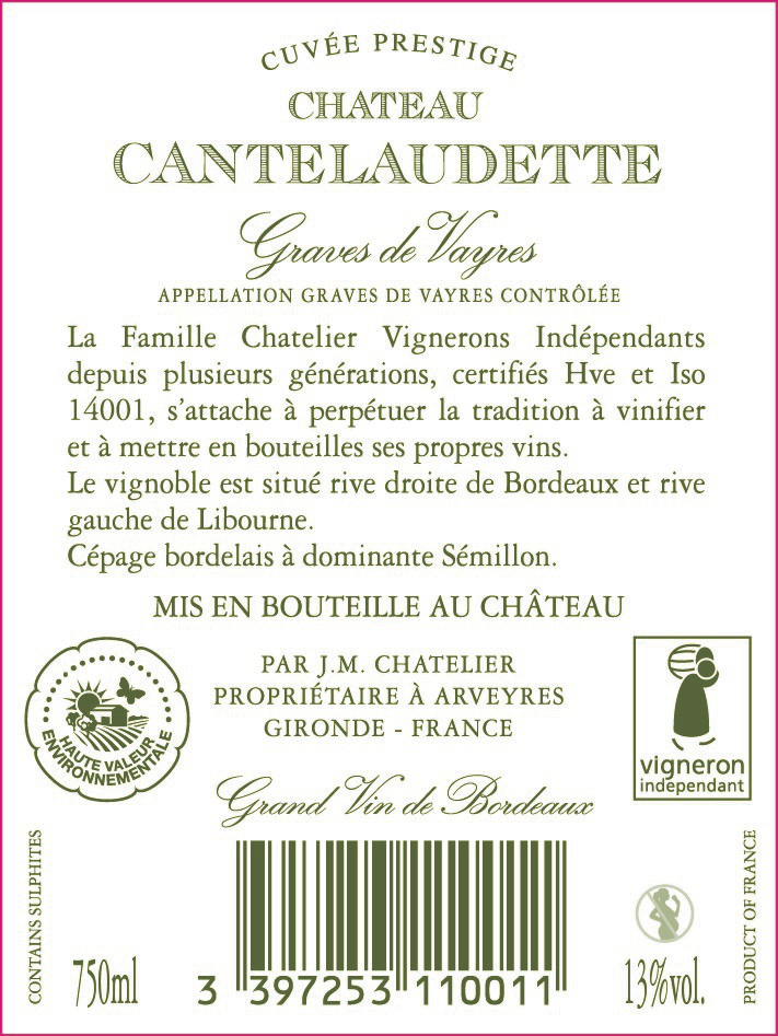 | Libellé | Château Cantelaudette Cuvée Prestige, 2024 - Graves de vayres AOP - Blanc Sec - 75 cl |