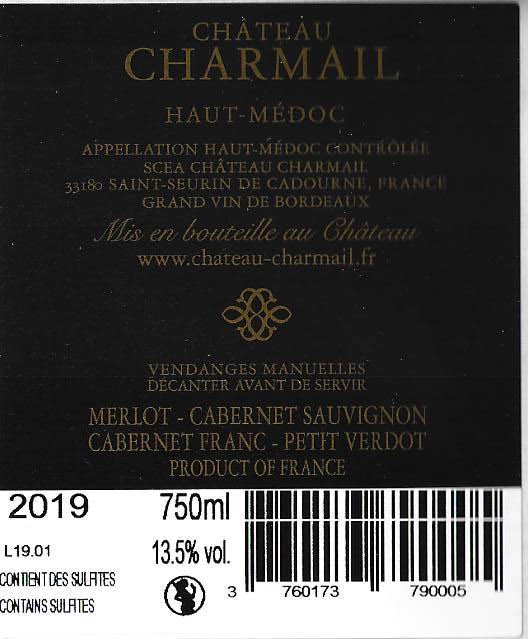 | Libellé | Château Charmail, 2019 - Haut-Médoc A.O.C. - Rouge - 75 cl |