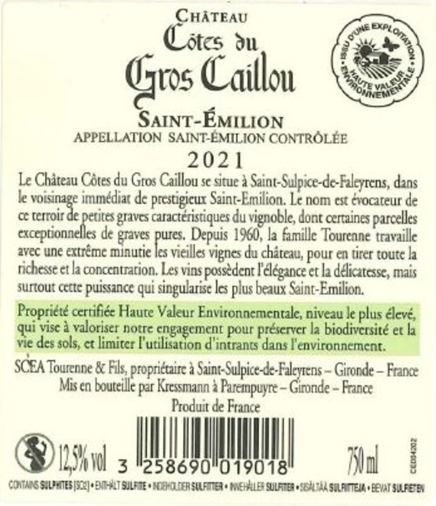 | Libellé | CHÂTEAU COTES DU GROS CAILLOU, 2021 - Saint-Emilion AOP - Rouge - 75 cl |