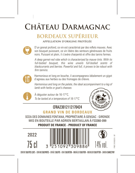 | Libellé | Château Darmagnac , 2022 - Bordeaux Supérieur AOP - Rouge - 75 cl |