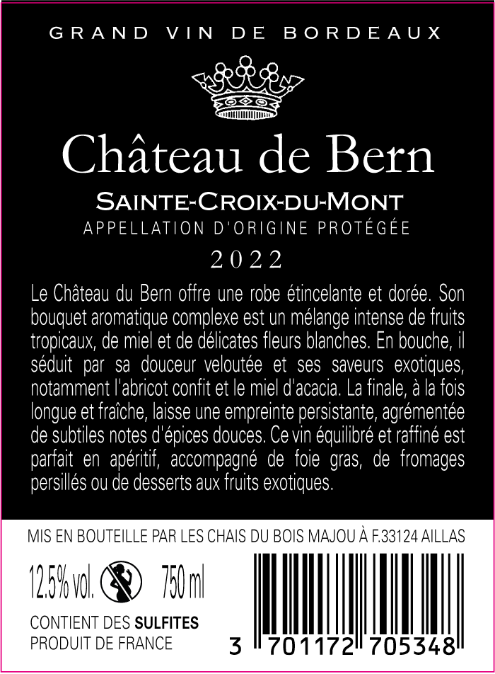 | Libellé | Château de Bern, 2022 - Sainte-Croix-du-Mont AOP - Blanc Moelleux - 75 cl |