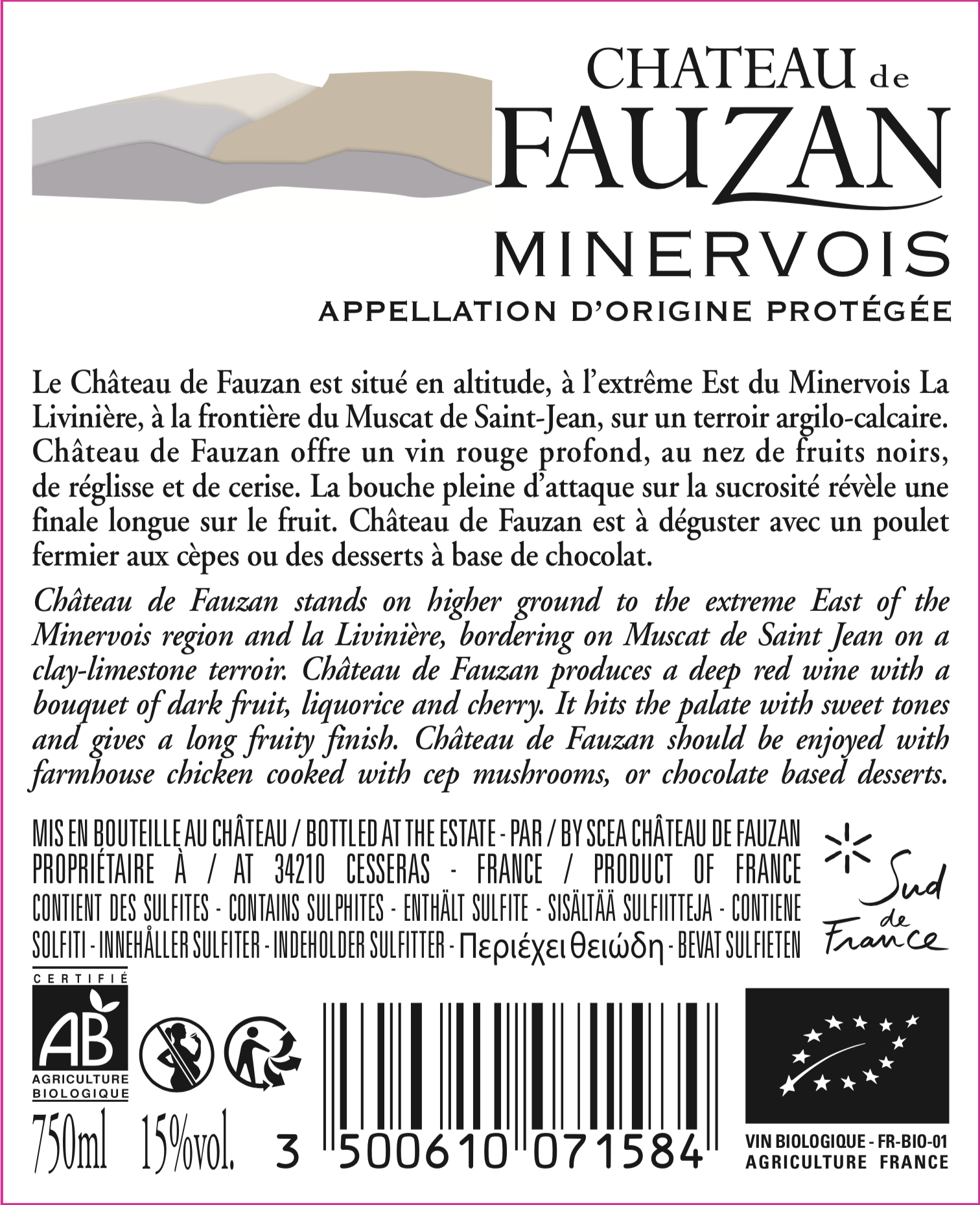 | Libellé | Château de Fauzan BIO, 2023 - Minervois AOP - Rouge - 75 cl |
